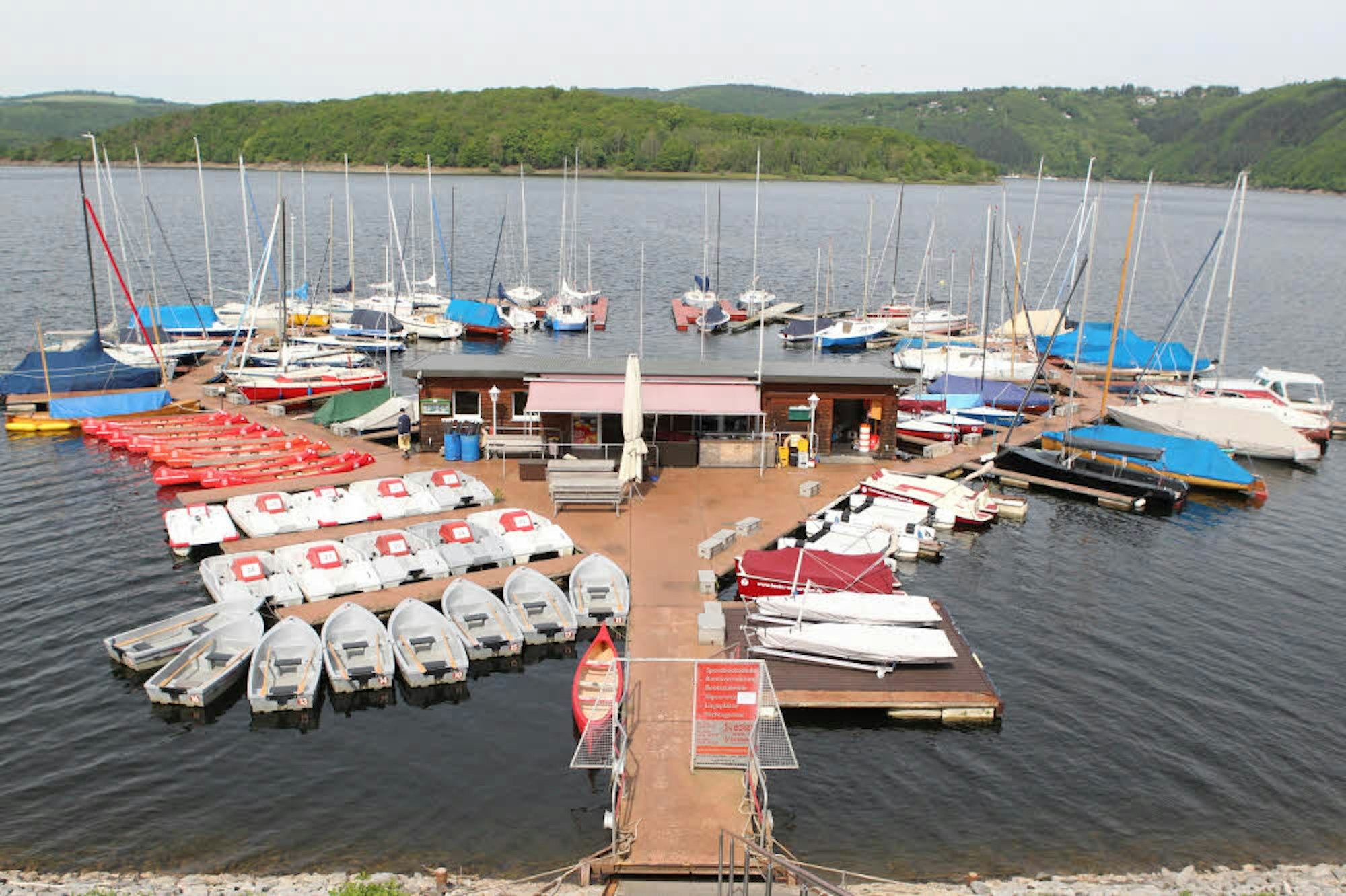 Fast lautlos kann man mit den Elektrobooten der Rursee-Schifffahrt durch den Nationalpark Eifel gleiten. Auf dem Obersee steuern sie von Einruhr über Rurberg direkt die Urftsee-Staumauer an. Und auf dem Rursee pendeln Boote zwischen dem Schiffsanleger Heimbach-Schwammenauel und Rurberg.In Schwammenauel kann man auch Elektro-, Tret- und Ruderboote ausleihen.