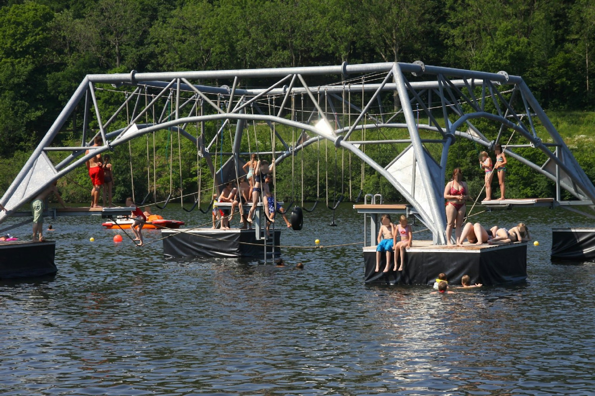 Eine besondere Attraktion ist der deutschlandweit einmalige Wasserseilgarten. Das Klettergerüst, an dem Seile und Reifen hängen, schwimmt auf dem Wasser. Wenn beim Klettern die Kräfte nachlassen, fällt man in den See.
