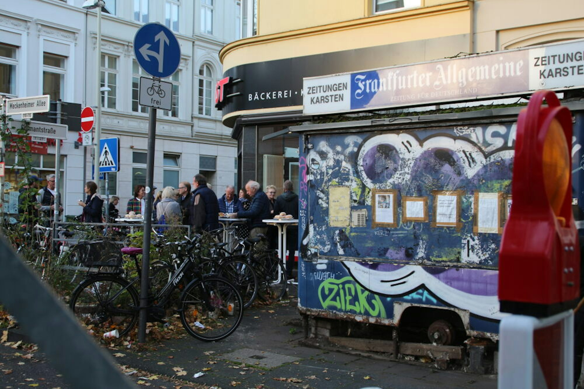 Spannend war es auch für die Anwohner, die normalerweise immer ihre Zeitung im Kiosk gekauft haben. Viele sind am Morgen der Einladung von Anwohner Bernd Martinius gefolgt, um sich von „ihrem“ Büdchen zu verabschieden. Zusammen haben sie belegte Brötchen und Berliner sowie Kaffee vom Bäcker nebenan organisiert. „Es war ein Teil von uns“, sagte Martinius. „Ich war seit über 30 Jahren Kunde. Das war ein Anlaufpunkt“, erzählte er.