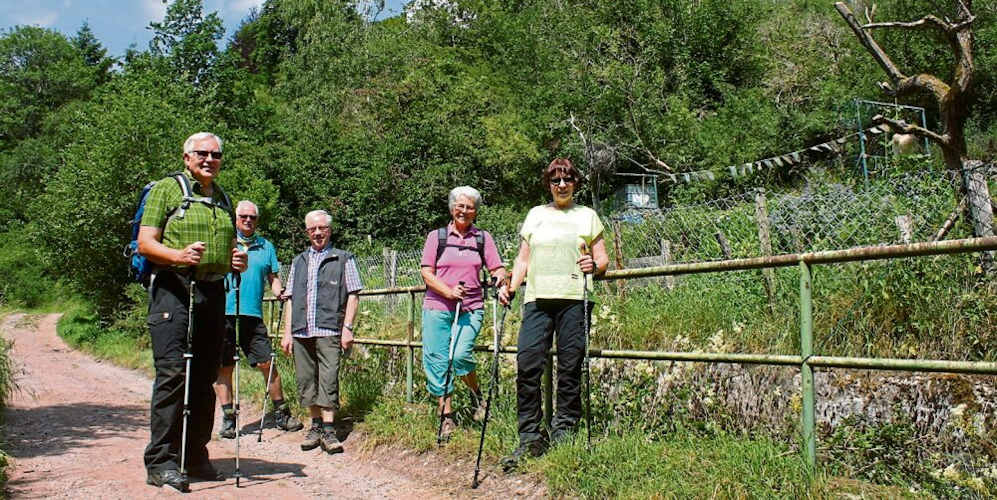 Gute Laune auf dem Weg hat die Eifelvereins-Wandergruppe am Fuß des Reifferscheider Burgbergs.