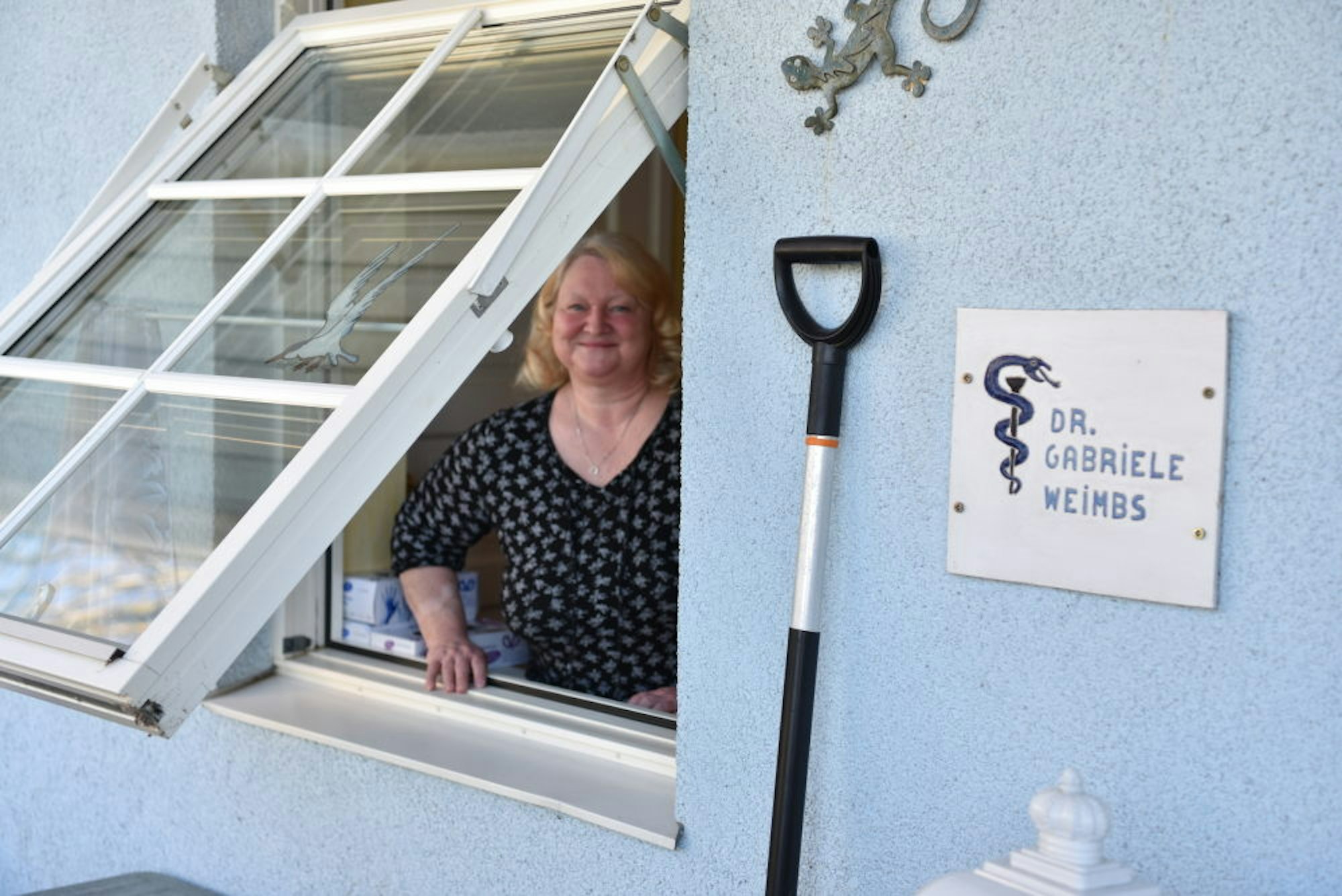 Außerdem gibt es bei ihr jetzt so etwas wie ein Sprechstunde durchs Fenster. Sie habe praktischerweise eine Art Kioskfenster am Eingang der Praxis, sagt sie und lacht. Vom Fenster aus könne sie gut mit den Patienten, die noch zur Praxis kommen, kommunizieren.