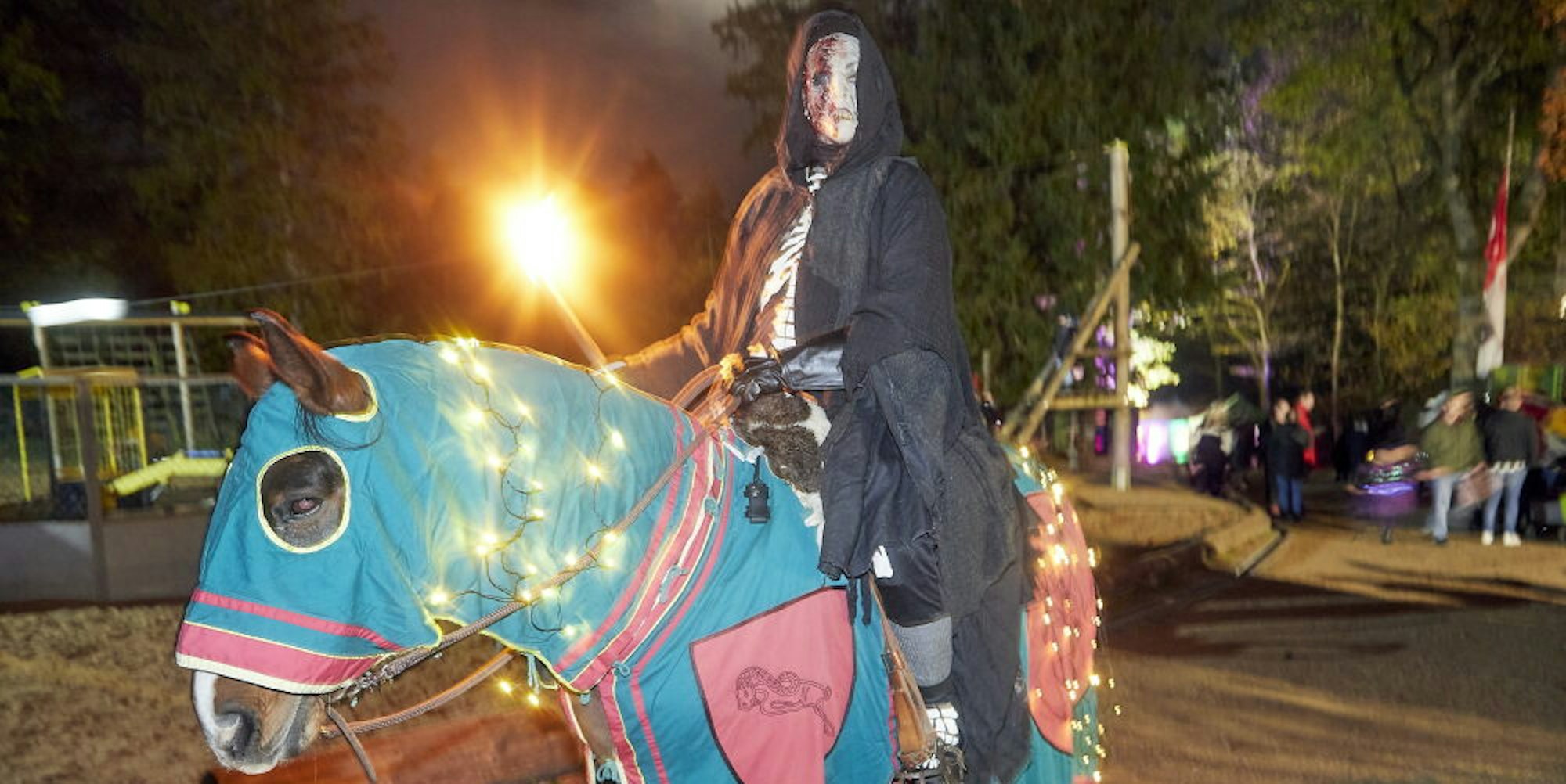 Hoher Gruselfaktor: Hermann Klinkhammer als untoter Reiter im Wildfreigehege in Hellenthal.