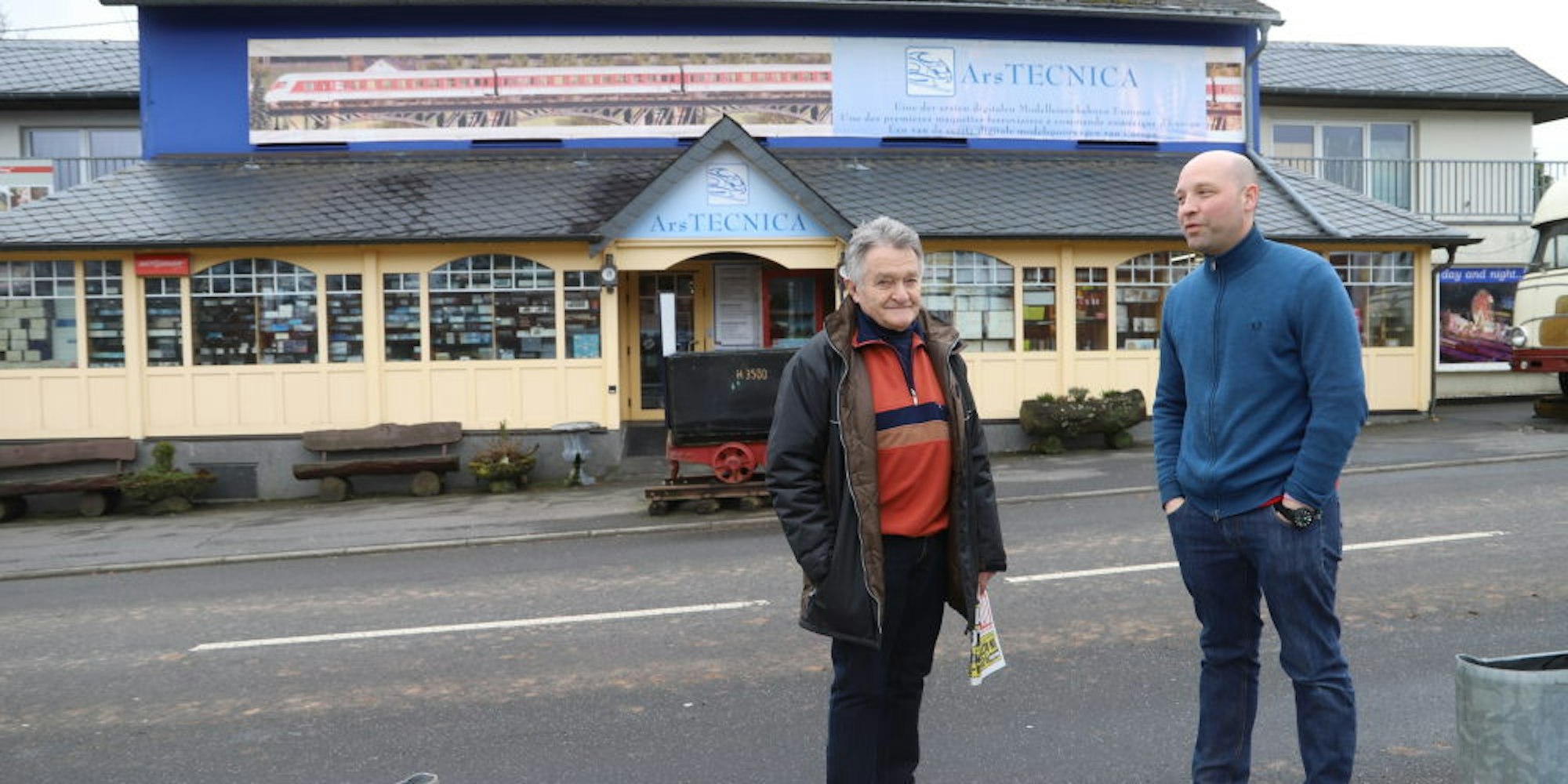 Vor dem ehemaligen Zollamt in Losheim, steht Supermarkt- und Cafébetreiber Michael Balter (r.) mit einem ehemaligen Zöllner.