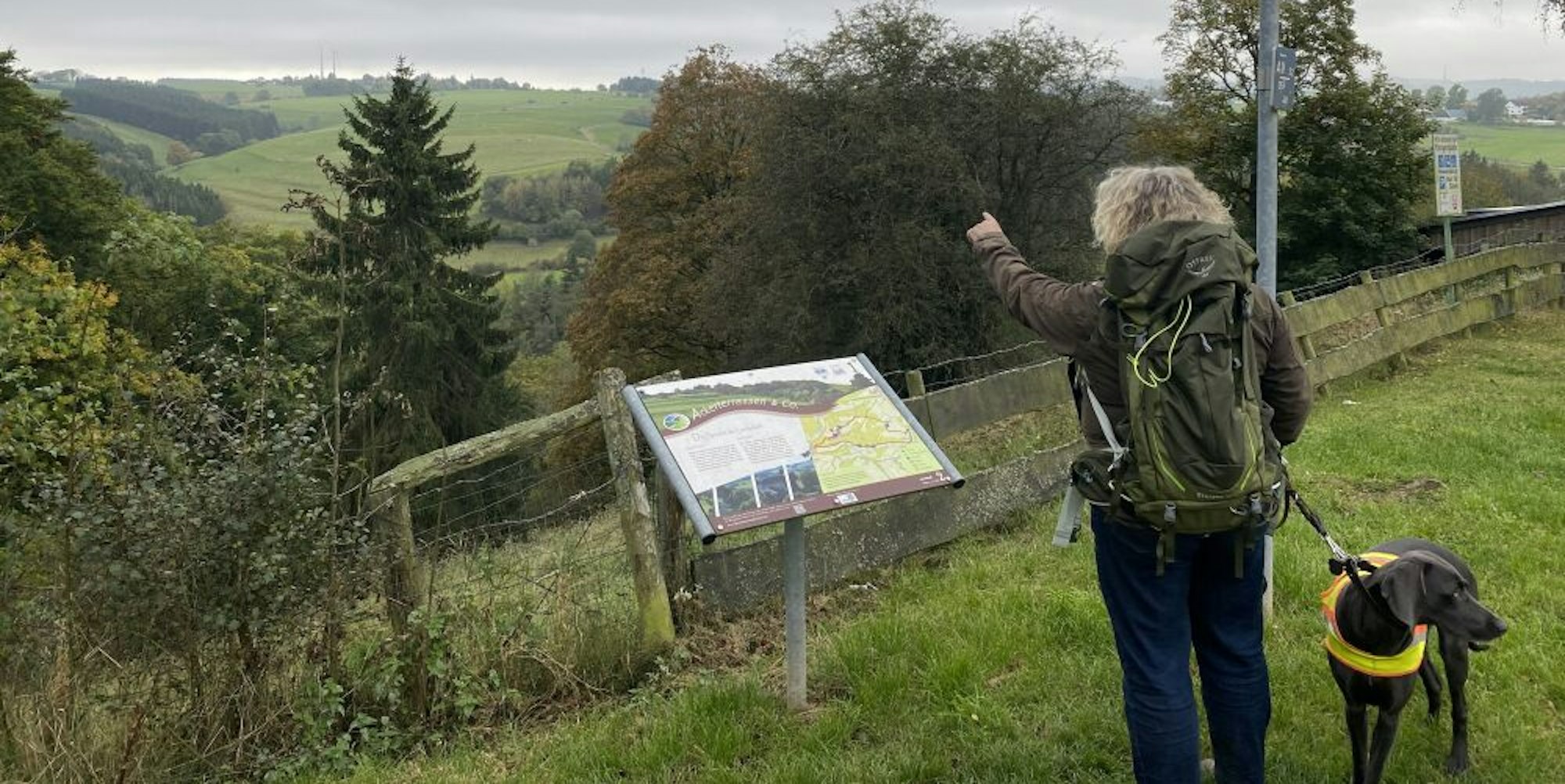 Wir starten unsere Mini-Wanderung, die nach Belieben ausgeweitet werden kann, vom Parkplatz an der Wildenburg und genießen zunächst den Blick ins Hellenthaler Ländchen, wie die Einheimischen das Gebiet bezeichnen. Offene Flächen, Grünland, auf dem im Sommer unter anderem Orchideen blühen, und Ackerterrassen aus alten Zeiten, die seinerzeit das Bewirtschaften der steilen Hangflächen ermöglichten.