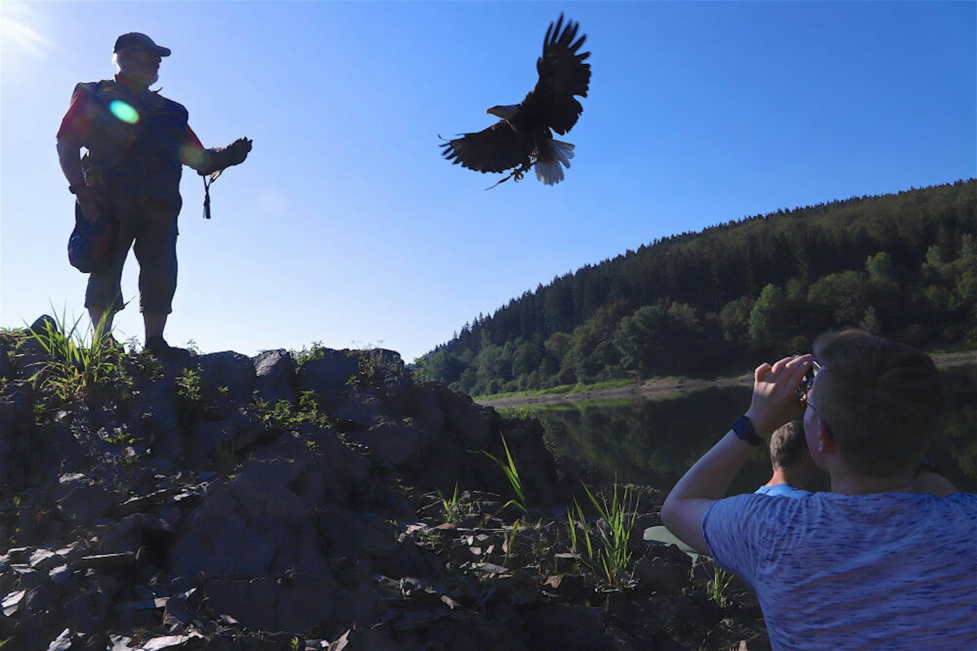 Während die Sonne vom Himmel sticht, gellt Fischers kräftige Stimme über den Olefstausee. „Aika“, ruft er laut. Etwa 300 Meter entfernt steigt einer der drei Vögel, die mit ihren Falknern warten, in die Luft, um sich dann knapp über der Wasseroberfläche treiben zu lassen. Zielgenau schwebt er auf die kleine Gruppe zu. Aufgeregt klicken die Verschlüsse der Fotoapparate, versuchen die vier Fotografen angestrengt, ihr Ziel, das sich so schnell auf sie zu bewegt, in der Optik zu halten.