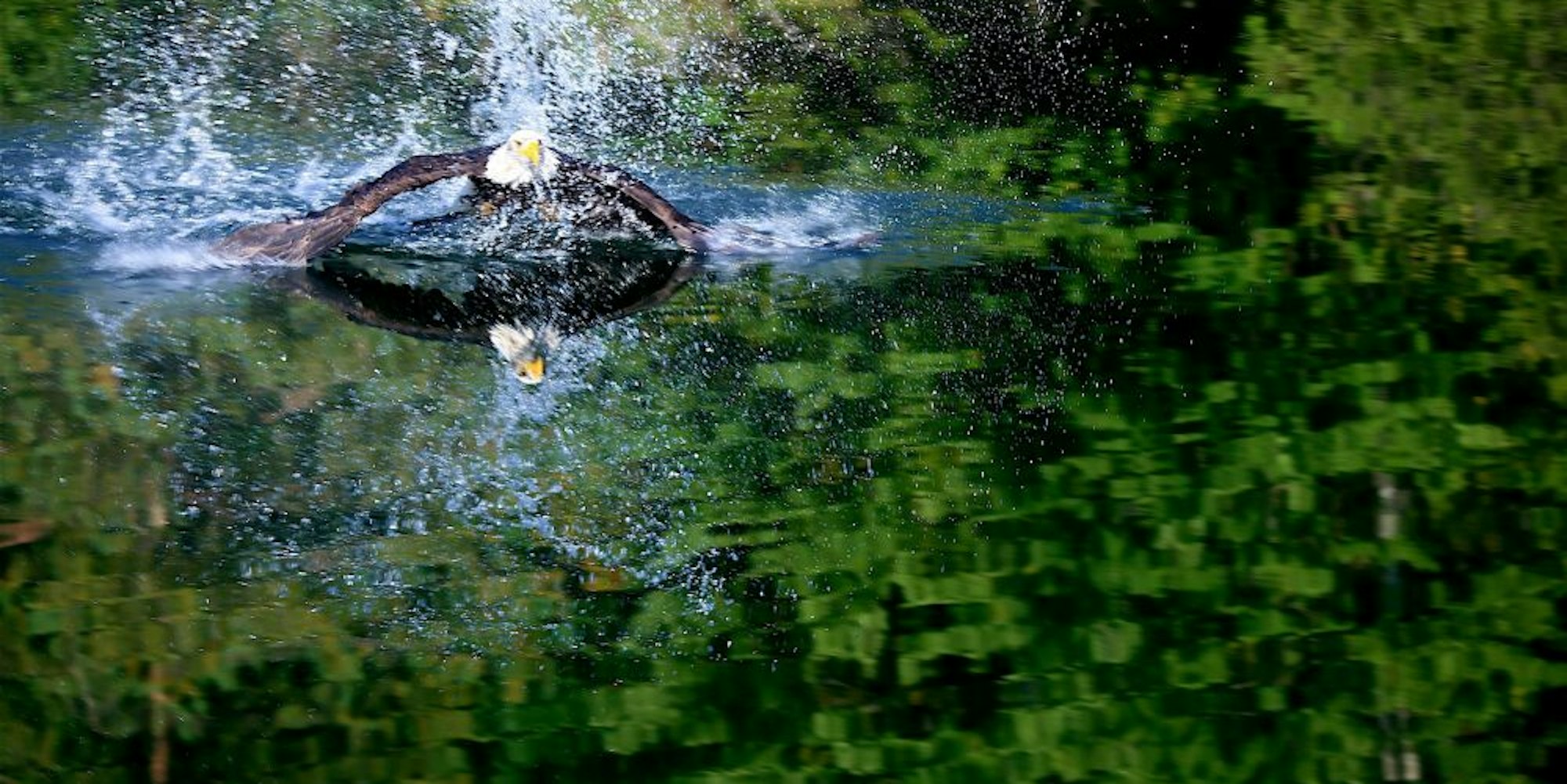 Eigentlich sollte Aika nun direkt auf Fischer zuhalten, doch der Adler hat offensichtlich Lust auf ein erfrischendes Bad. Kurz vor der Landzunge, auf der die Kameras wild klicken, dreht der Vogel ab, steckt einen Flügel ins Wasser und landet platschend im See.