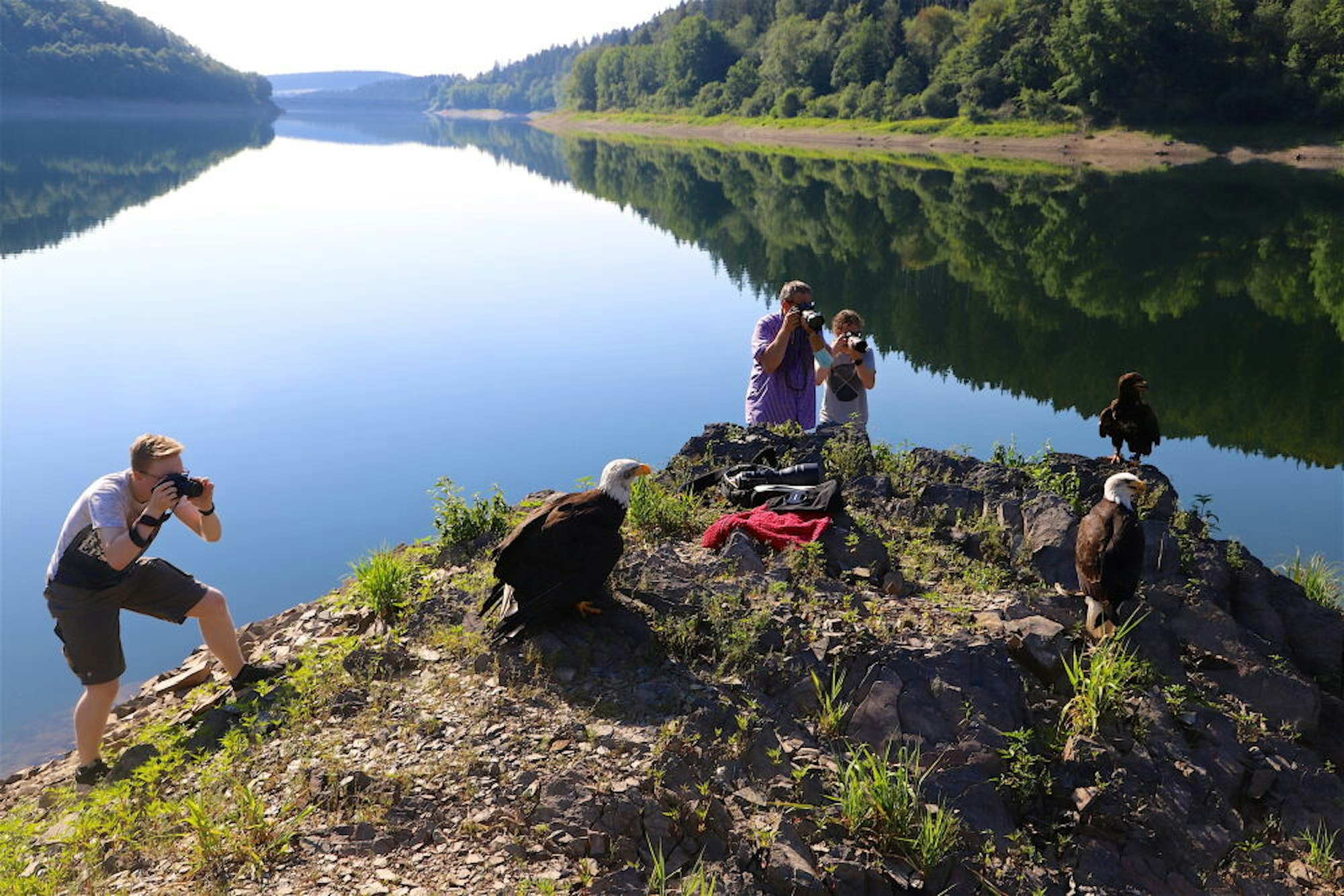 „Wie hoch sollen sie fliegen?“, fragt Fischer. „Möglichst niedrig“, wünscht sich Liebertz, damit auch das Spiegelbild der Adler im Wasser mit auf das Foto komme. Drei bis vier Flüge seien für die Vögel möglich, kündigt Fischer an. „Es ist zu heiß“, sagt er. Keine Thermik über der Wasseroberfläche, kein Wind. Still ruht der See, ideale Bedingungen für Fotos, nicht so ideal, um über das Wasser zu fliegen.