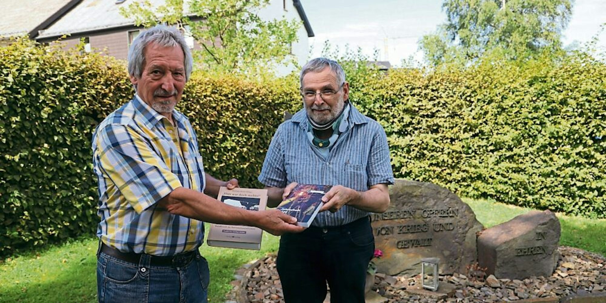 Am Ehrenmal an der Giescheider Kapelle überreichte Roland Burkhart (l.) ein Exemplar des Buches an Karl Reger vom Arbeitskreis Judit.H.