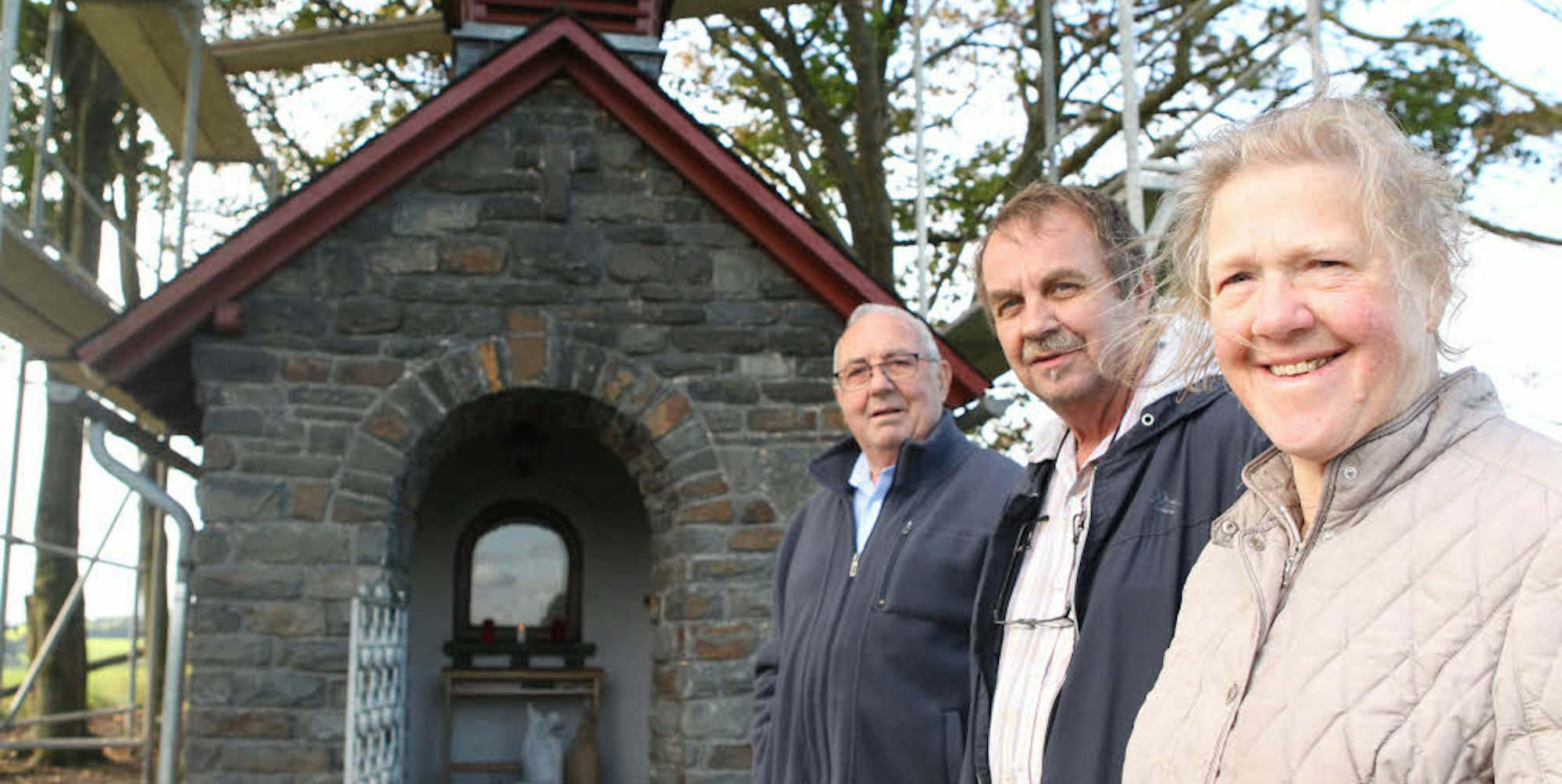 Manfred Schmitz (v.l.), Hermann-Josef Kreitmeier und Hedwig Straßfeld zählen zu den Helfern, die sich um die Kapelle kümmern.