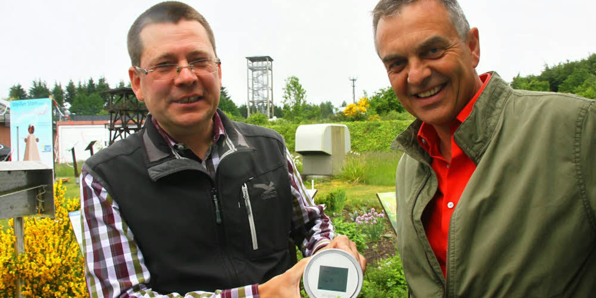 Die laut Dr. Karsten Brandt (l.) beste Luft Deutschlands atmet er mit Hellenthals Bürgermeister Rudolf Westerburg an der Wetterstation am Weißen Stein.
