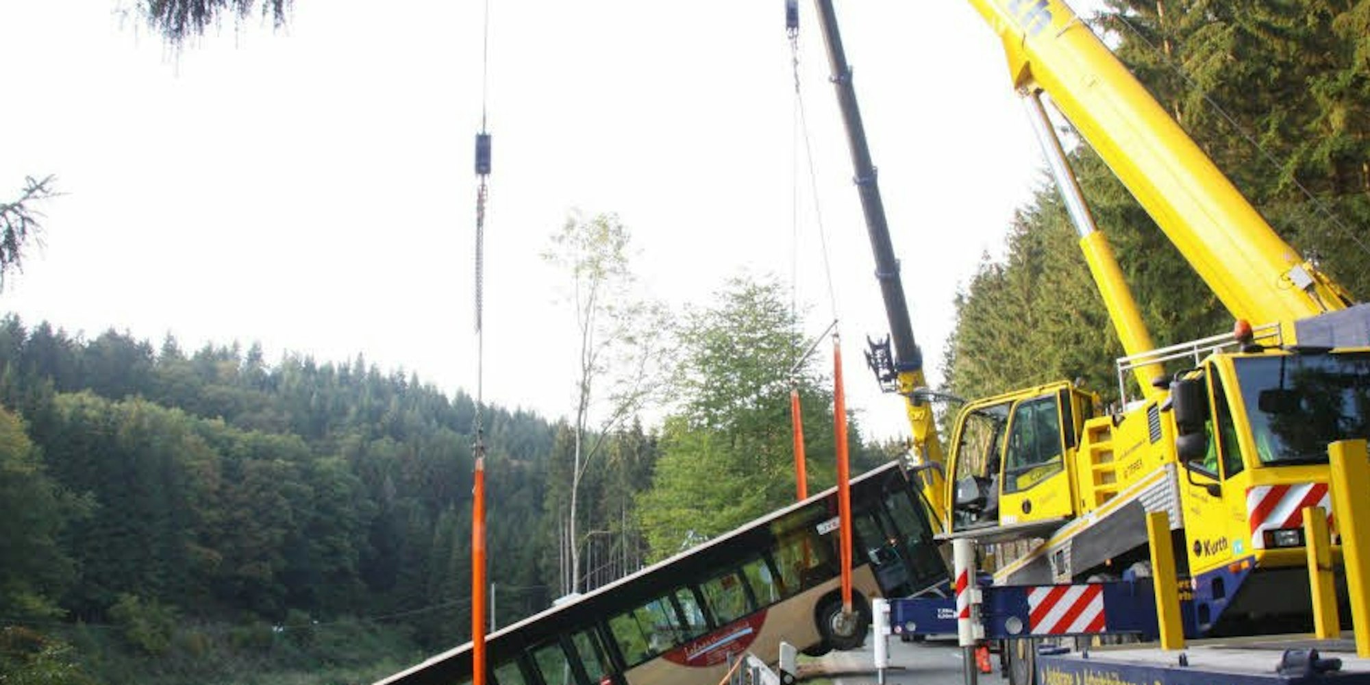 Zwei starke Kräne waren nötig, um den Bus zu bergen. Die Landstraße L 159 war bis in den Abend gesperrt.