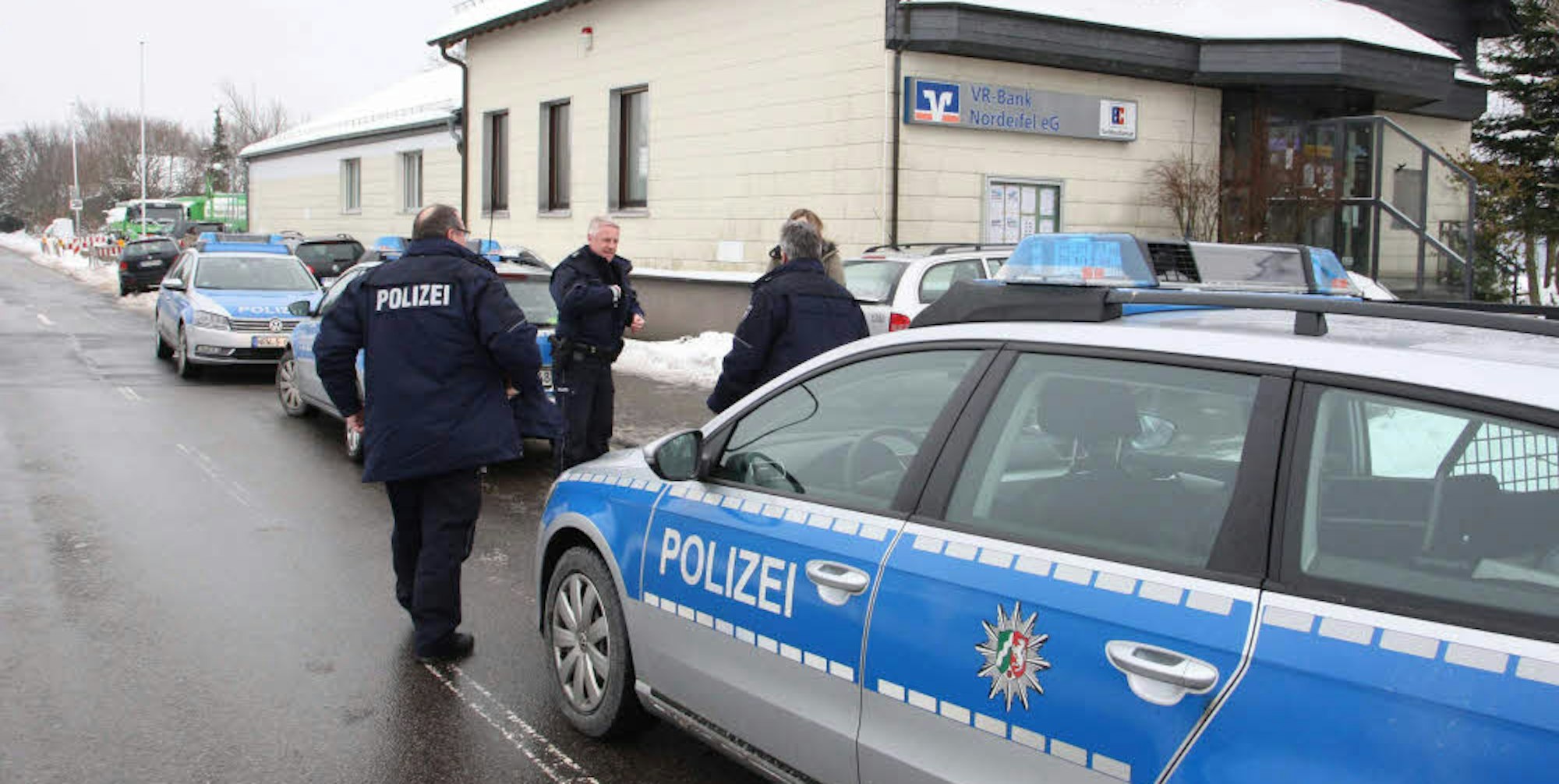 Ein Großaufgebot der Polizei eilte nach dem Überfall auf die VR-Bank-Filiale am Karnevalsdienstag 2013 nach Rescheid.