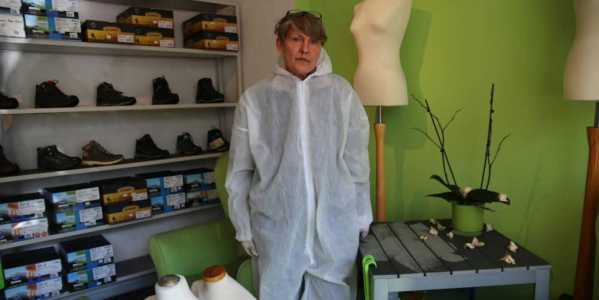 Im Schutzanzug macht Kirsten Kummer in ihrem Geschäft „Drinnen und Draußen“ Inventur für die Versicherung.