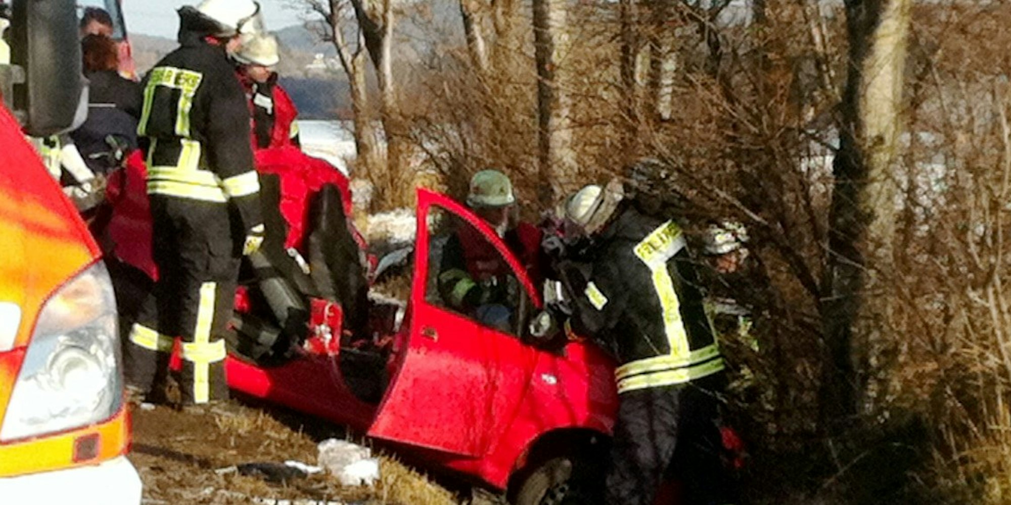 Durch den Aufprall schleuderte das vorausfahrende Fahrzeug in den rechten Straßengraben. Die beiden Insassen, ein 49-jähriger Fahrer aus dem Mechernicher Stadtgebiet und seine Beifahrerin, mussten von der freiwilligen Feuerwehr befreit werden. Dafür schnitten die Hilfskräfte das Dach des Wagens ab.