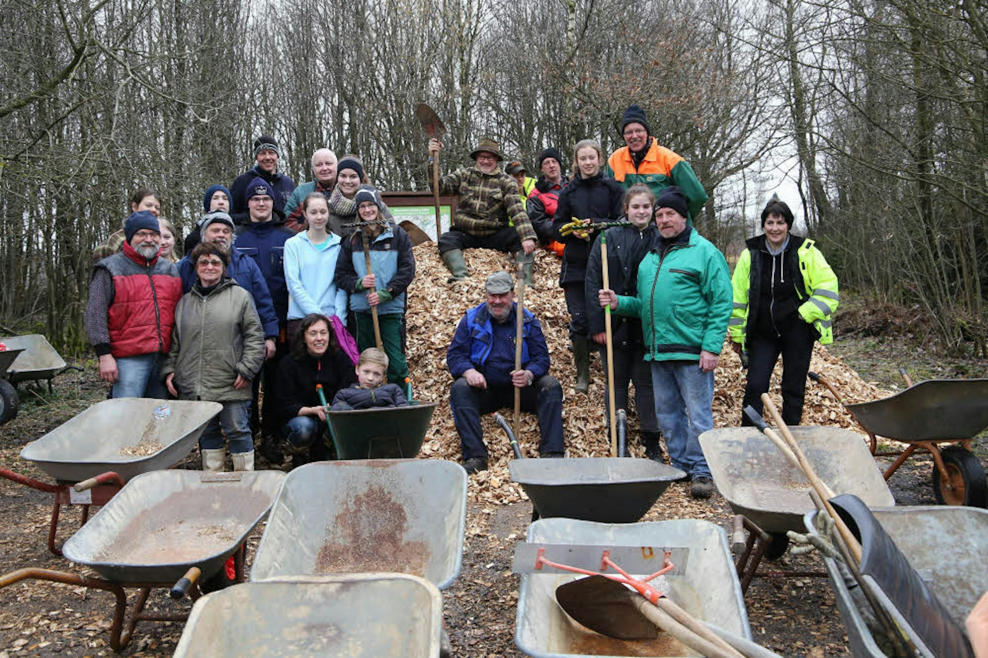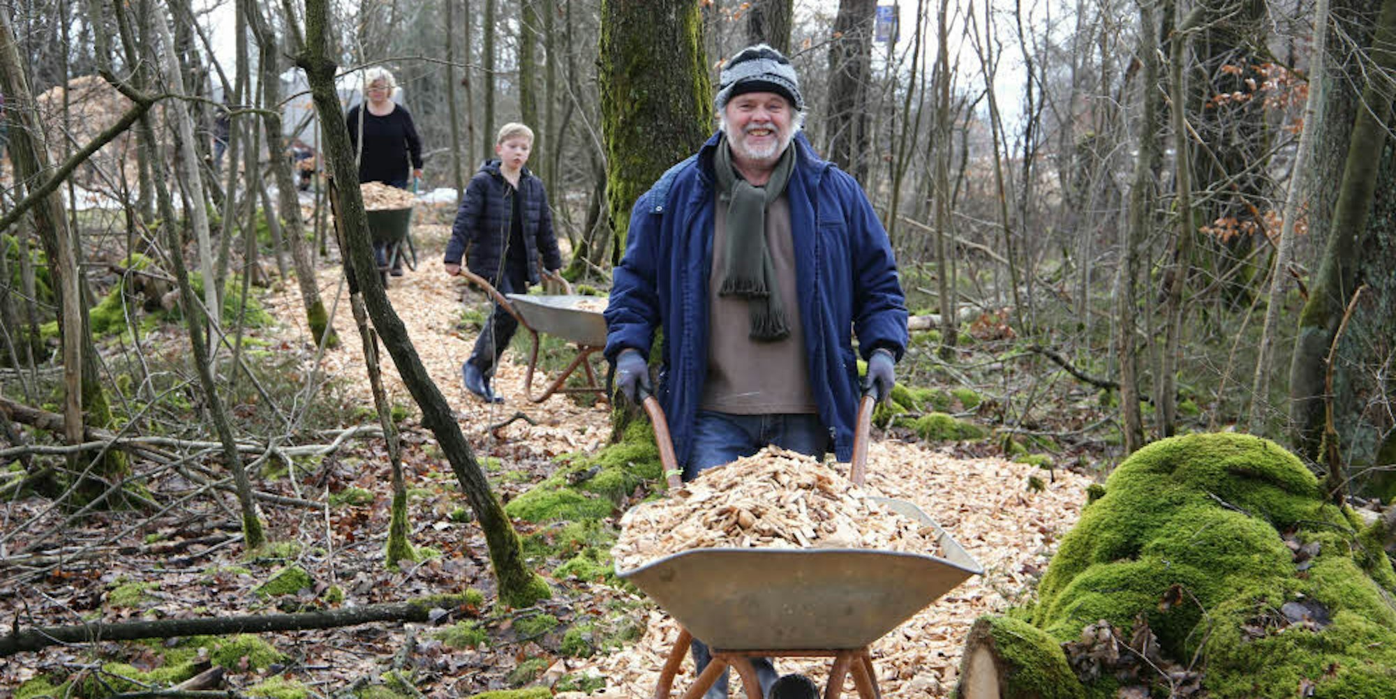Unermüdlich karrten die Helfer Hackschnitzel in den Wald. Es galt schließlich, einen Weg im Naturschutzgebiet anzulegen. Dafür war Muskelkraft gefordert.
