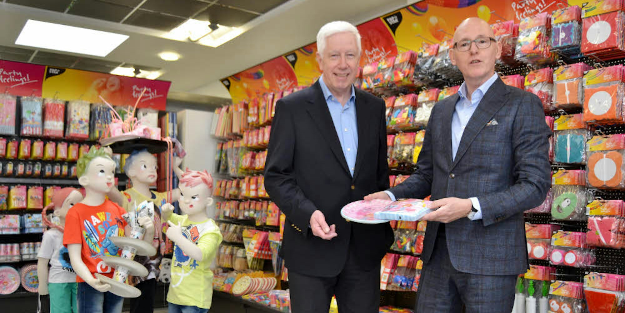7000 Artikel werden vertrieben: Geschäftsführer Bert Kantelberg (l.) und Marketingleiter Wolfgang Küpper im Papstar-Showroom.