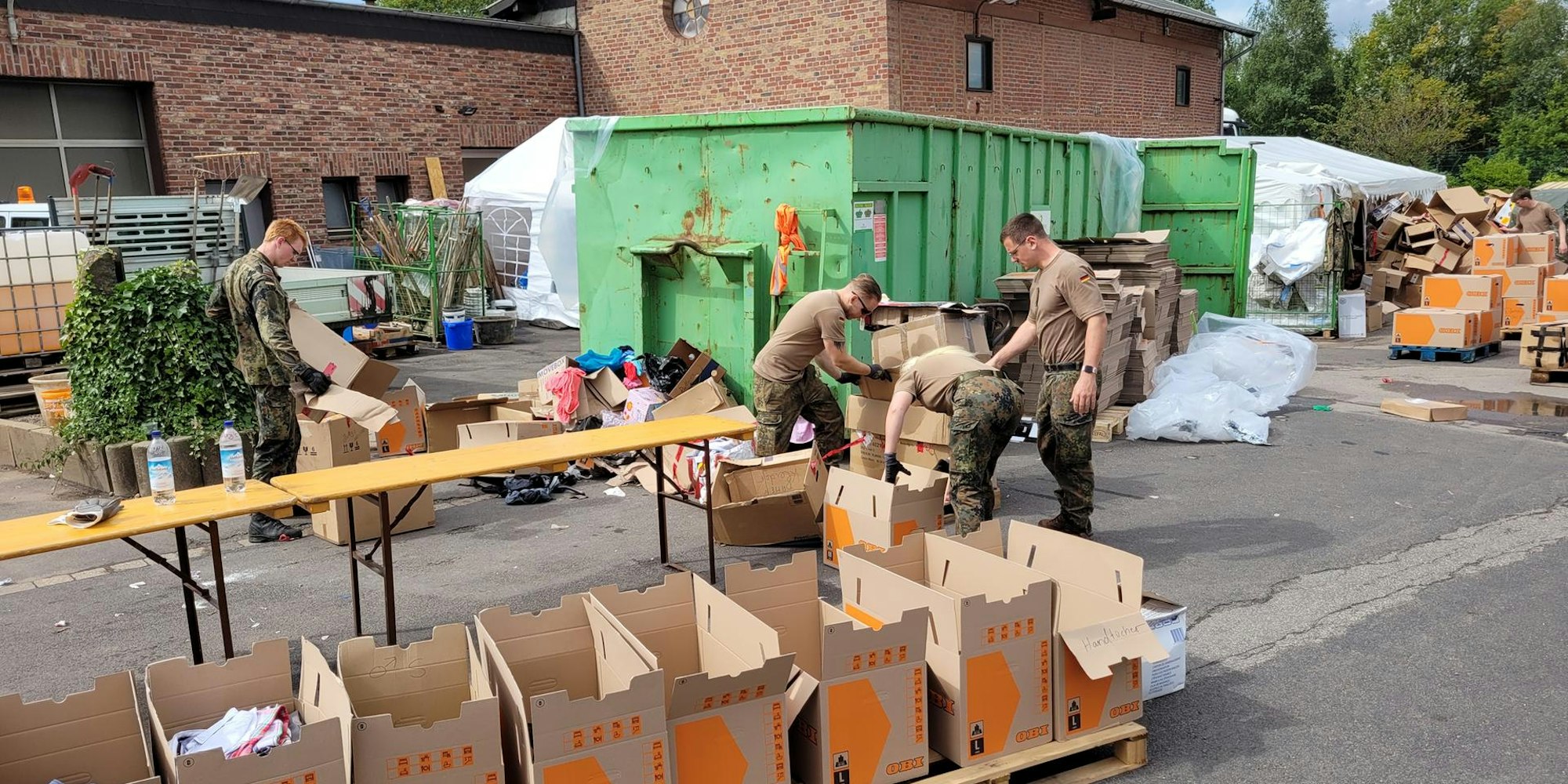 Am Wochenende erhielten die ehrenamtlichen Helfer auch im Bauhof Unterstützung von der Bundeswehr. 30 Männer und Frauen einer Heereseinheit aus der Nähe von Bielefeld sortierten die gespendeten Sachen, packten sie in Kartons und ummantelten diese mit Folie. Die Paletten sollen dann ins Sägewerk transportiert werden.