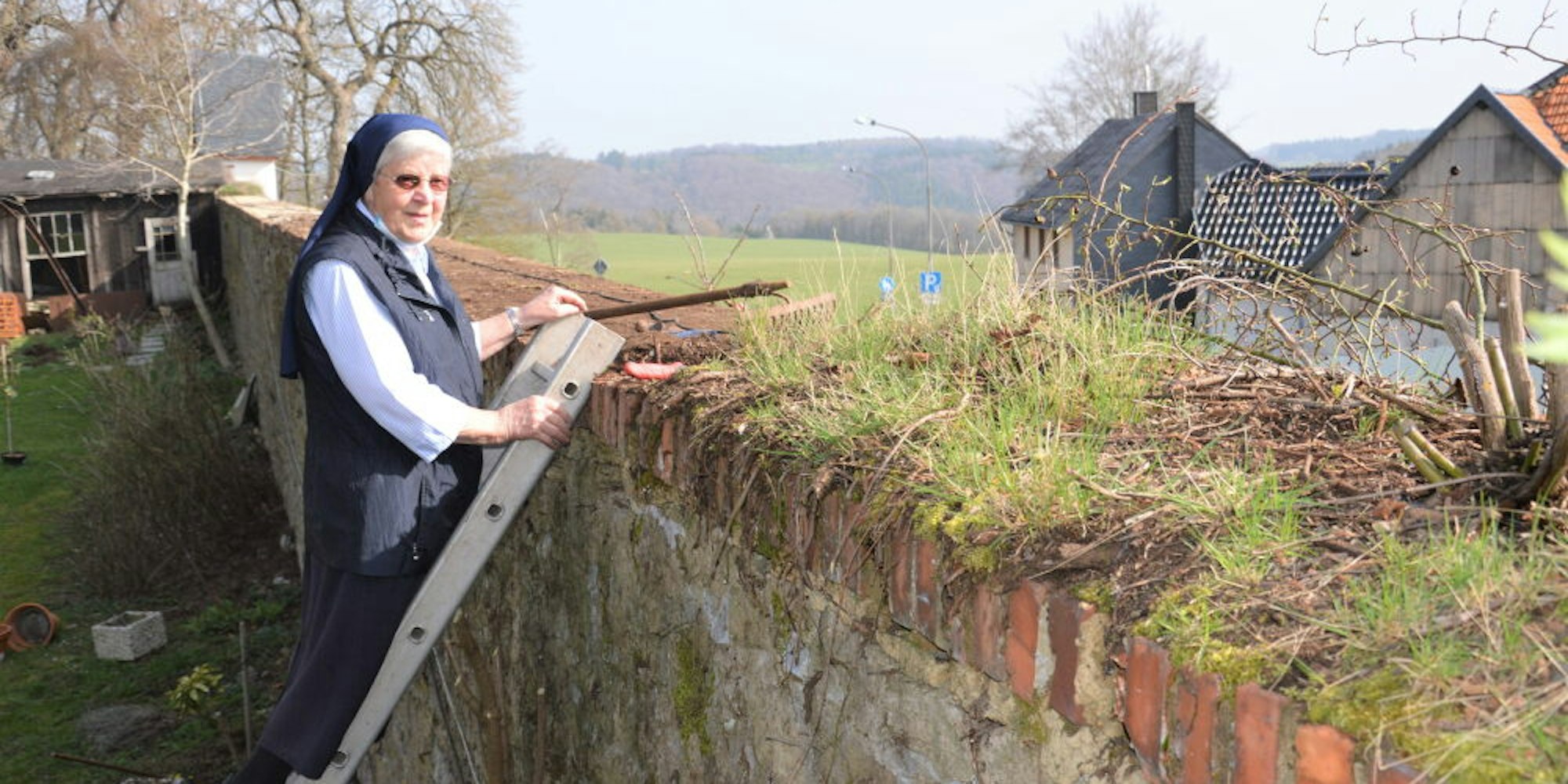 Ausgestattet mit verschiedenen Werkzeugen klettert Schwester Veronika auf die Leiter und säubert die Mauerkrone.