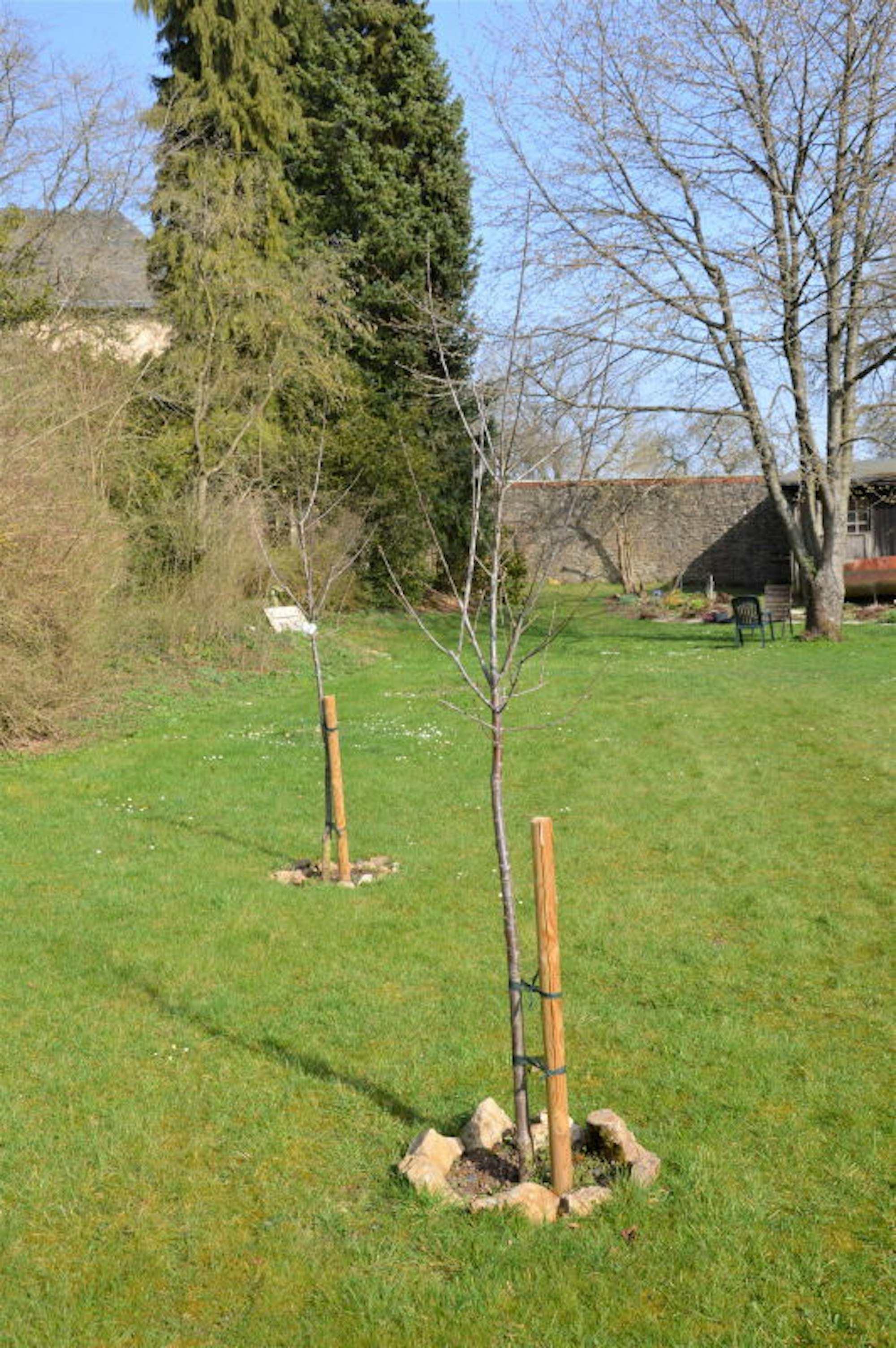 Zwei neu gepflanzte Bäume stehen auch in dem Garten.