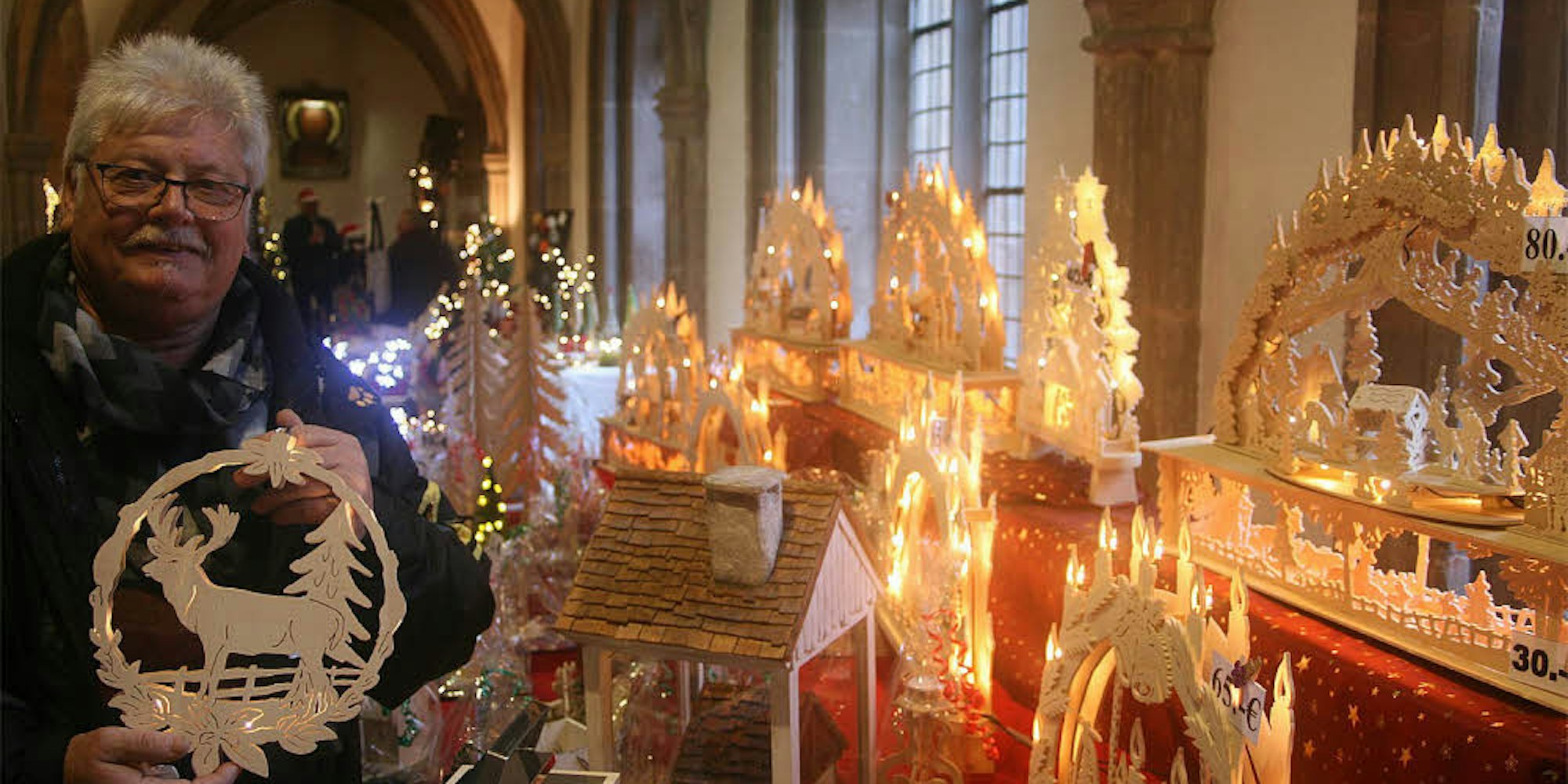 Selbst geschnitzte Lichterbögen aus Pappelholz verkaufte Günter Karst aus Zülpich.