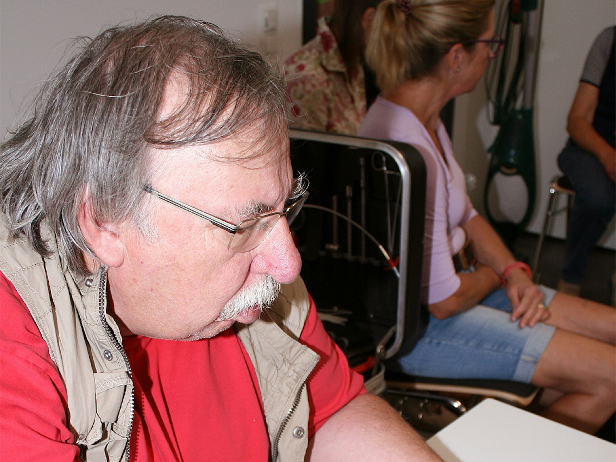 Doch schon kommen die ersten „Patienten“, während Nowag, ein großer Gemütsmensch, hinter seinem Arbeitstisch Platz nimmt. Stromprüfer, Spannungsmesser, Schraubenzieher und anderes Werkzeug hat er mitgebracht. In den kommenden zwei Stunden wird sein Ziel sein, die Helferlein in Haushalt und Werkstatt, die ihm auf den Tisch gelegt werden, wieder flott zu bekommen.