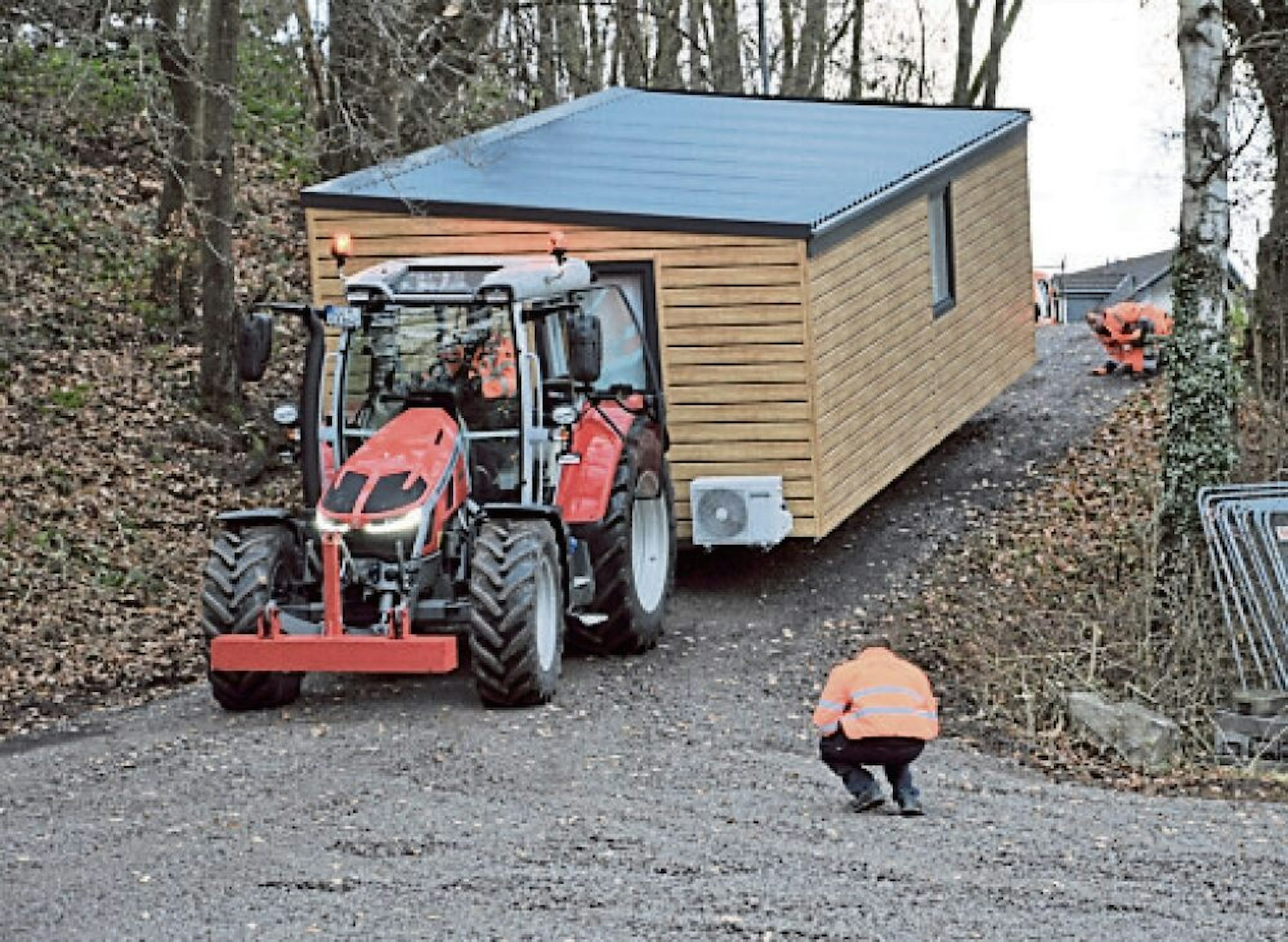 Die Tiny-Häuser wurden mit einem großen Traktor vom Siemensring auf den Fels gebracht. Vorneweg fuhr ein Polizeiwagen, in dem Hauptkommissar Jörg Schroeder saß. Knifflig wurde es auf der abschüssigen Zufahrt zum Grillplatz. Zwei Mitarbeiter des Bauhofs achteten dort darauf, dass die Anhänger mit der wertvollen Fracht während der Fahrt nicht aufsetzten. Die Häuser wurden in Reihe nebeneinander aufgestellt.