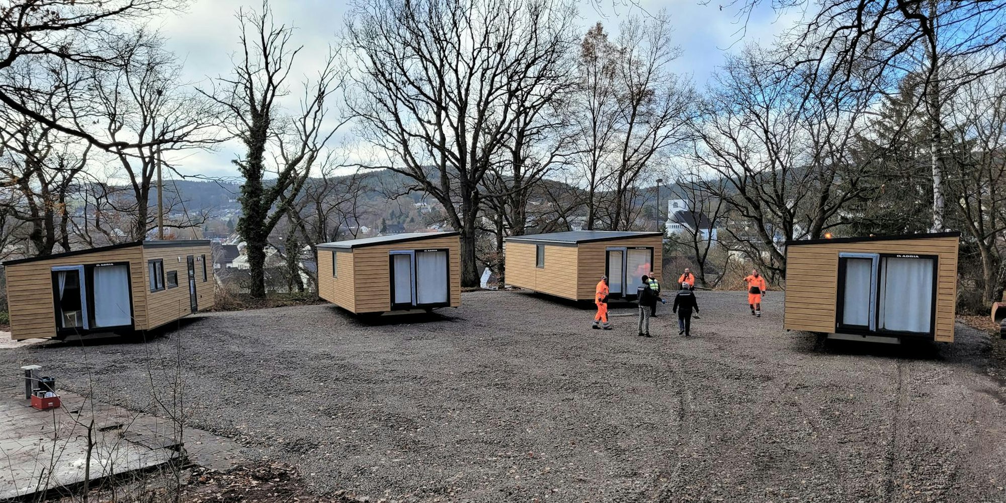 „Mitarbeiter vom Hersteller Adria werden sie am Donnerstag aufbocken und ausrichten“, erklärte Christoph Graf von der Gemeindeverwaltung. Die Hänger mit den Transporträdern bleiben unter den Häusern. Zum Abschluss erhält jedes Haus noch eine kleine Terrasse. „Der Blick von hier über Kall ist schön“, meinte Graf.