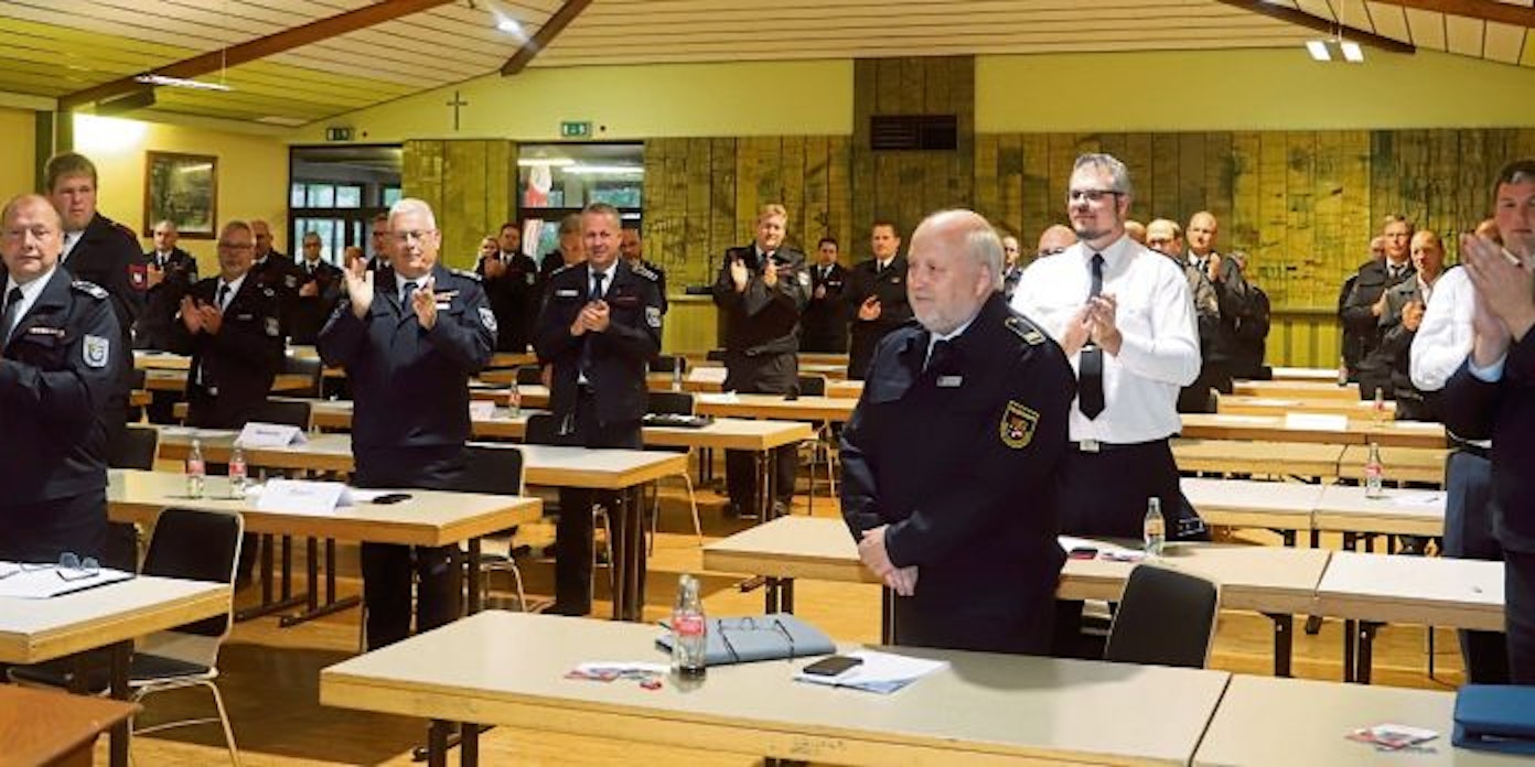 Applaus zum Abschied gab es für Udo Crespin (vorne). Der ehemalige Kreisbrandmeister hat auch den Vorsitz im Feuerwehrverband abgegeben.
