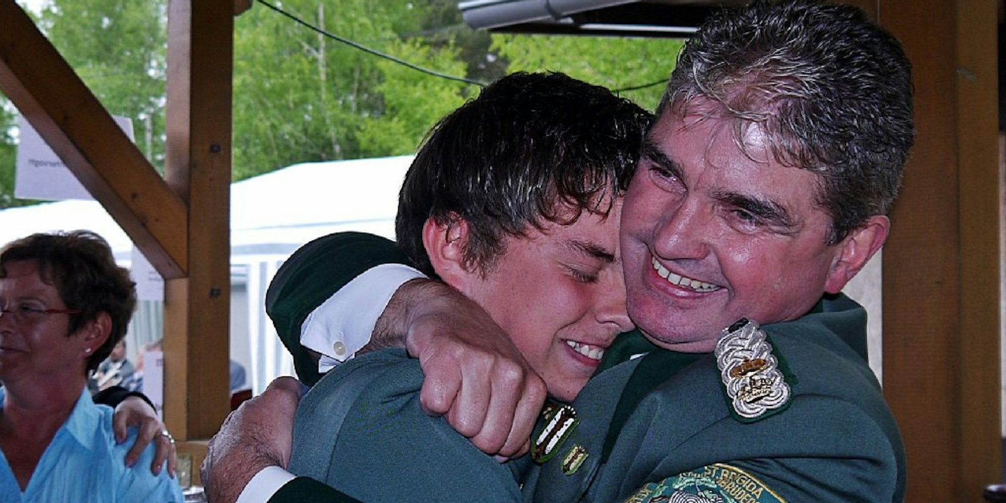 Der neue Schützenkaiser von Keldenich heißt Werner Hensch, hier gratuliert ihm sein Sohn Philipp, der neue Schülerprinz von Keldenich.