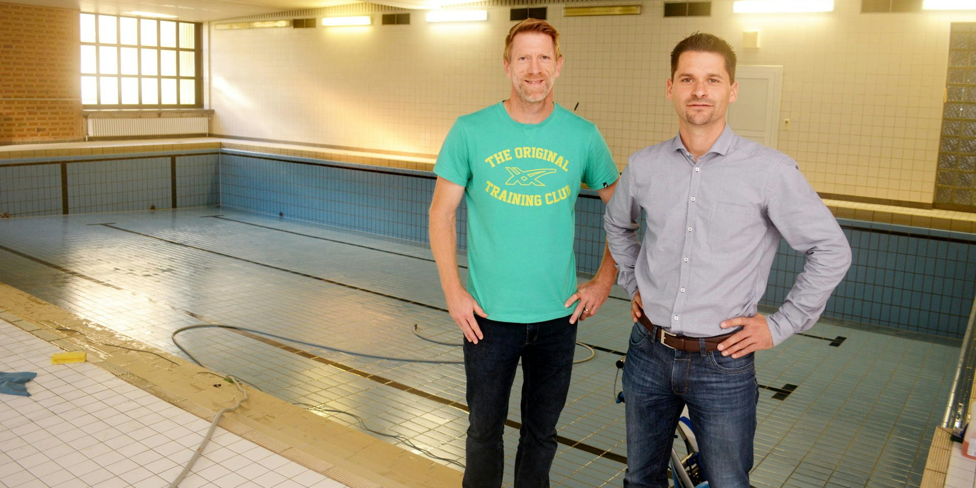 Sogar über ein eigenes Schwimmbad verfügt das Hermann-Josef-Kolleg in Steinfeld. Schulleiter Thomas Frauenkron (r.) und Rolf Kremp (Fachkonferenz Sport) werben nun damit, dass an ihrem Gymnasium auch Sport als viertes Abiturfach gewählt werden kann.