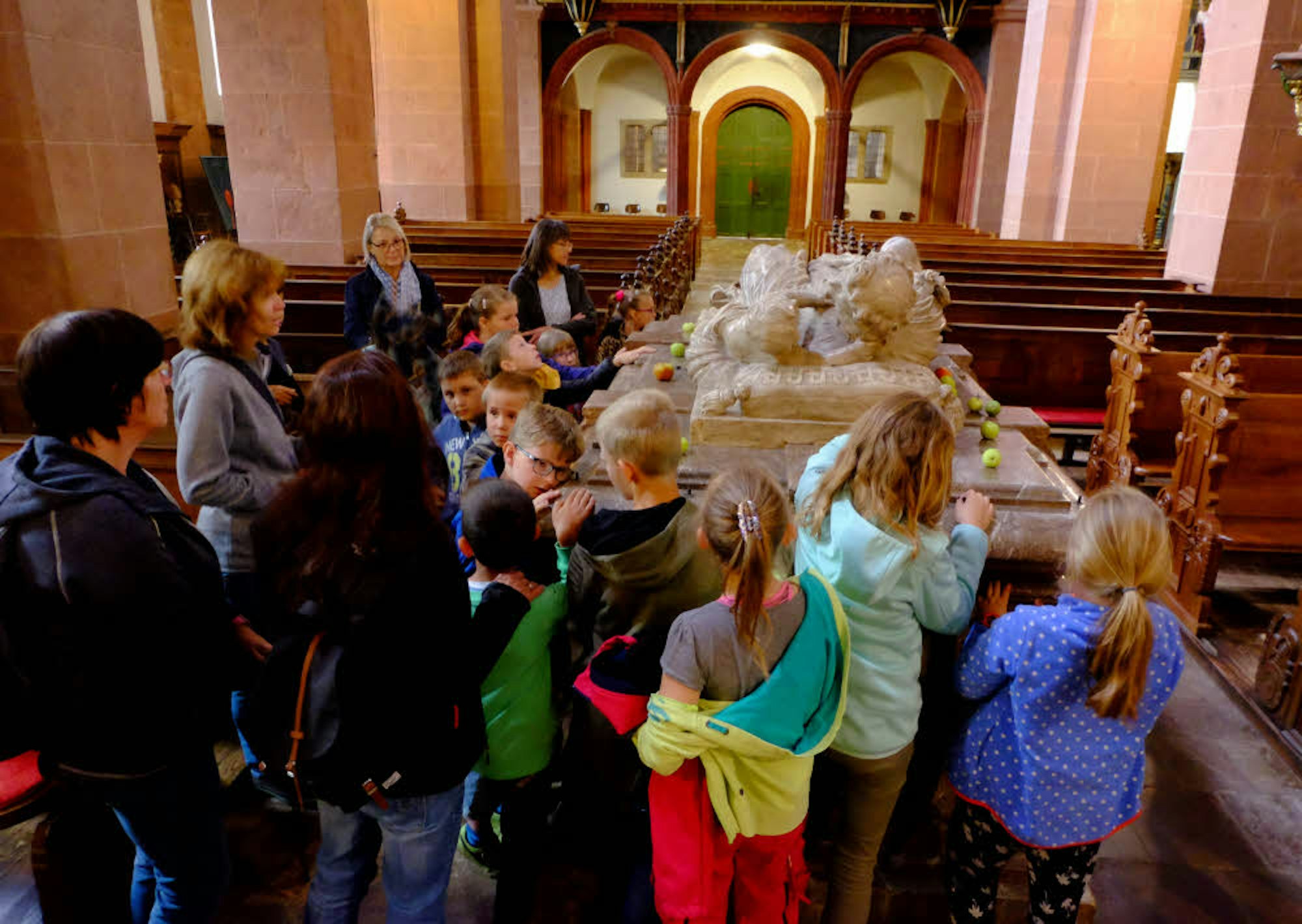 Warum liegen Äpfel auf dem Grabmal des Heiligen? Auch das erklärte die Pastoralreferentin Kindern und Erwachsenen bei der Führung.