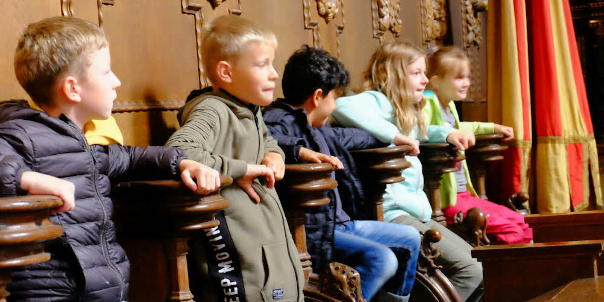 Spaß im Chorgestühl: Die Jungen und Mädchen von der Offenen Ganztagsschule Blankenheim probierten bei der Kirchenführung die Klappsitze im Altarraum der Basilika Steinfeld gerne aus.