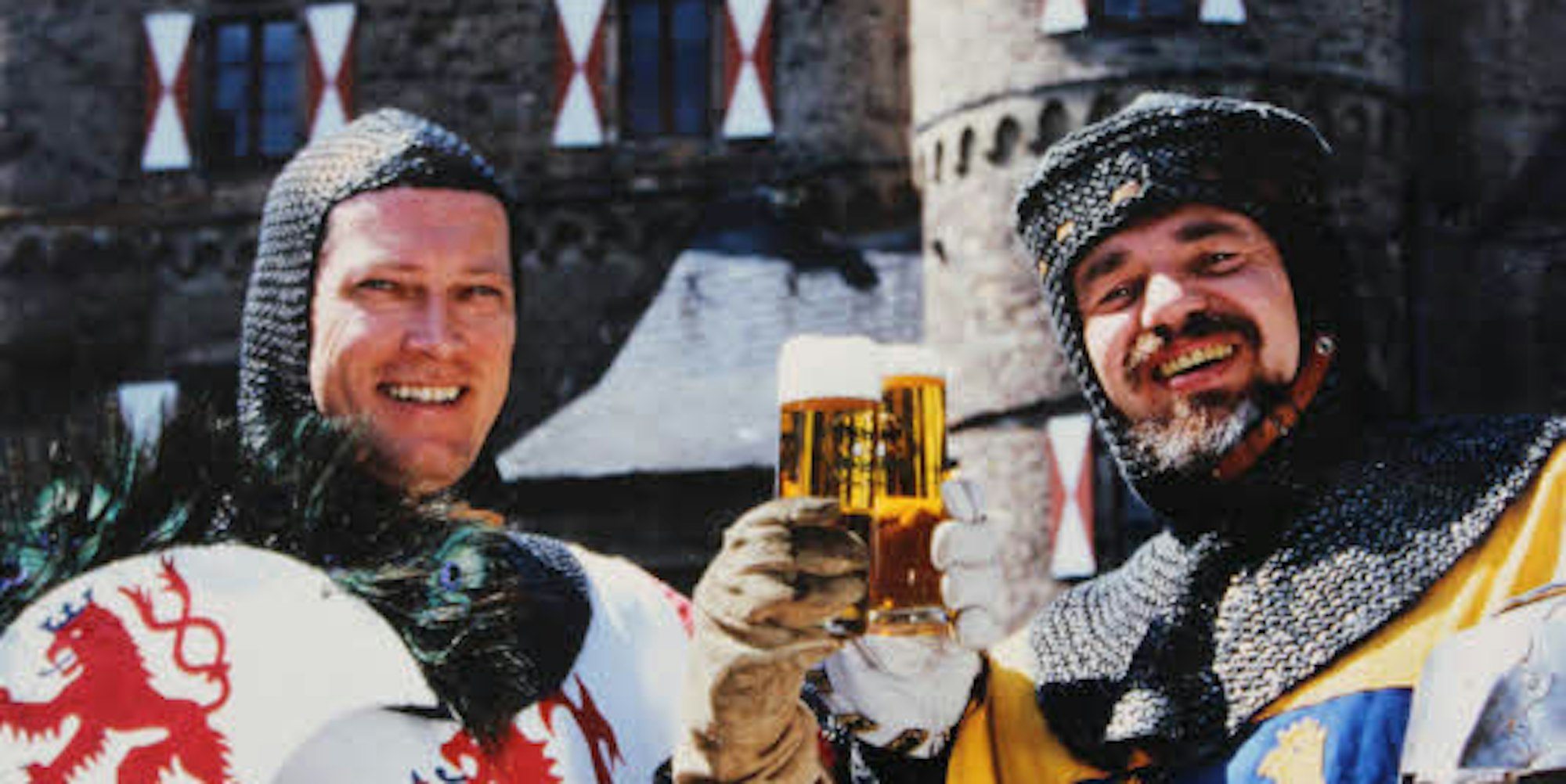 Treue Gefährten: Gemeinsam hoben Burgherr Franz Josef Graf Beissel von Gymnich (l.) und Hans Dieter Wolf die Ritterspiele aus der Taufe. Nach der „Schlacht“ wurde mit einem kühlen Trunk auf den Erfolg angestoßen.