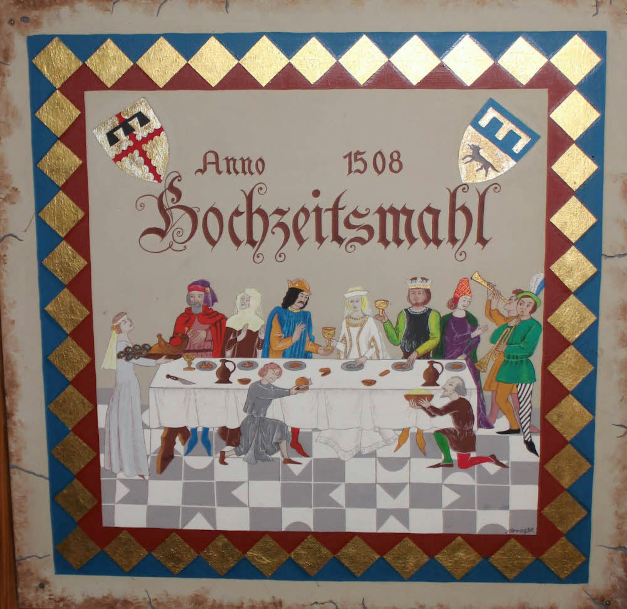 Im Wappensaal befinden sich zahlreiche filigrane Deckengemälde von Hans Dieter Wolf.