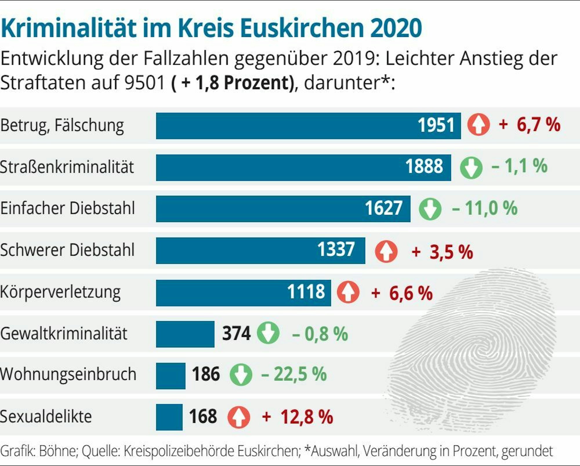 „Wir hätten gedacht, dass sich die Pandemie deutlich positiver auf die Statistik auswirkt“, sagte Huck. Polizeidirektor Harald Mertens berichtete, dass lediglich im ersten Lockdown die Zahl der Einsätze deutlich zurückgegangen sei. Neu in der Polizeistatistik ist der Subventionsbetrug im Rahmen der Corona-Pandemie. 34 Fälle verzeichnete die Euskirchener Polizei.