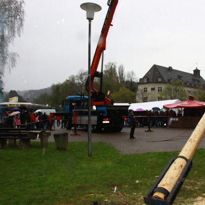 Vorsichtig bugsiert er den Teleskoplader unter einen wuchtigen Fichtenstamm, an dessen Spitze mit schweren Spanngurten eine Birke gebunden ist, bunt geschmückt. Im ersten Anlauf richtet Golbach den Maibaum im Doppel-T-Träger auf, Kumpel Timo Müller schraubt ihn dort fest. Nach rekordverdächtigen vier Minuten steht Holleraths Dorfmaibaum da, wo er seit acht Jahren am 1. Mai immer steht, an der Ecke Luxemburger Straße/Prethtalstraße. Dabei ist es noch keine 18 Uhr am 30. April.