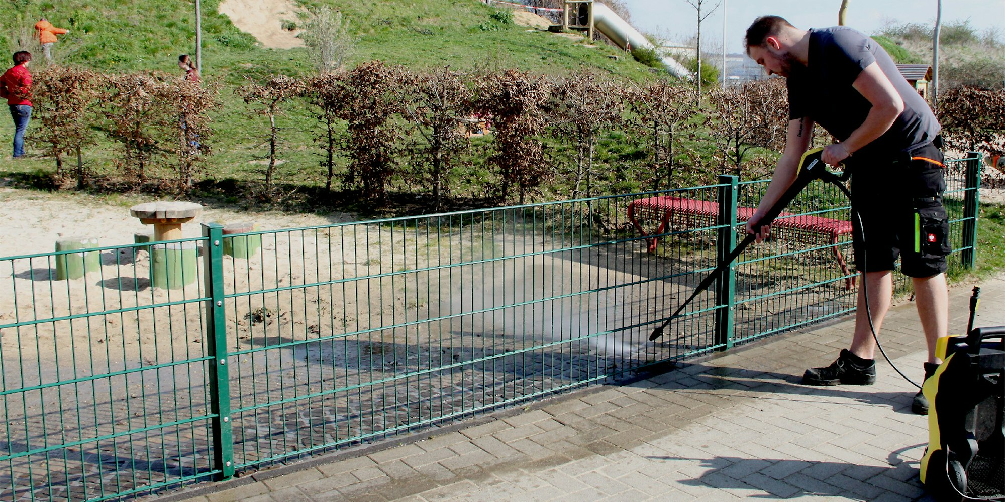 Erzieher Lukas Schwarz mit ungewohnten Aufgaben in der Kita Weilerswist-Süd: Er reinigt mit dem Hochdruckreiniger Gitter und Zäune im Außenbereich.
