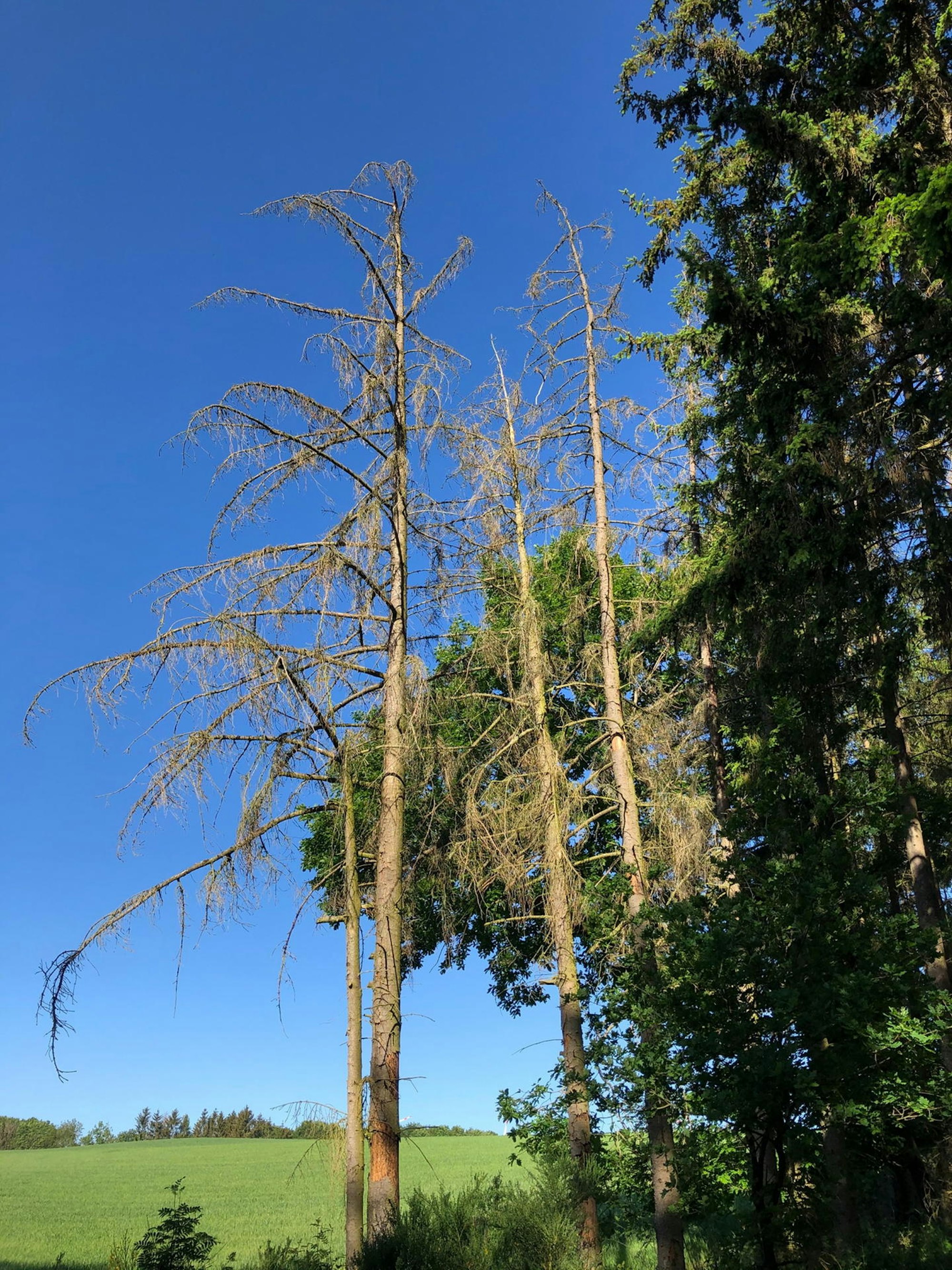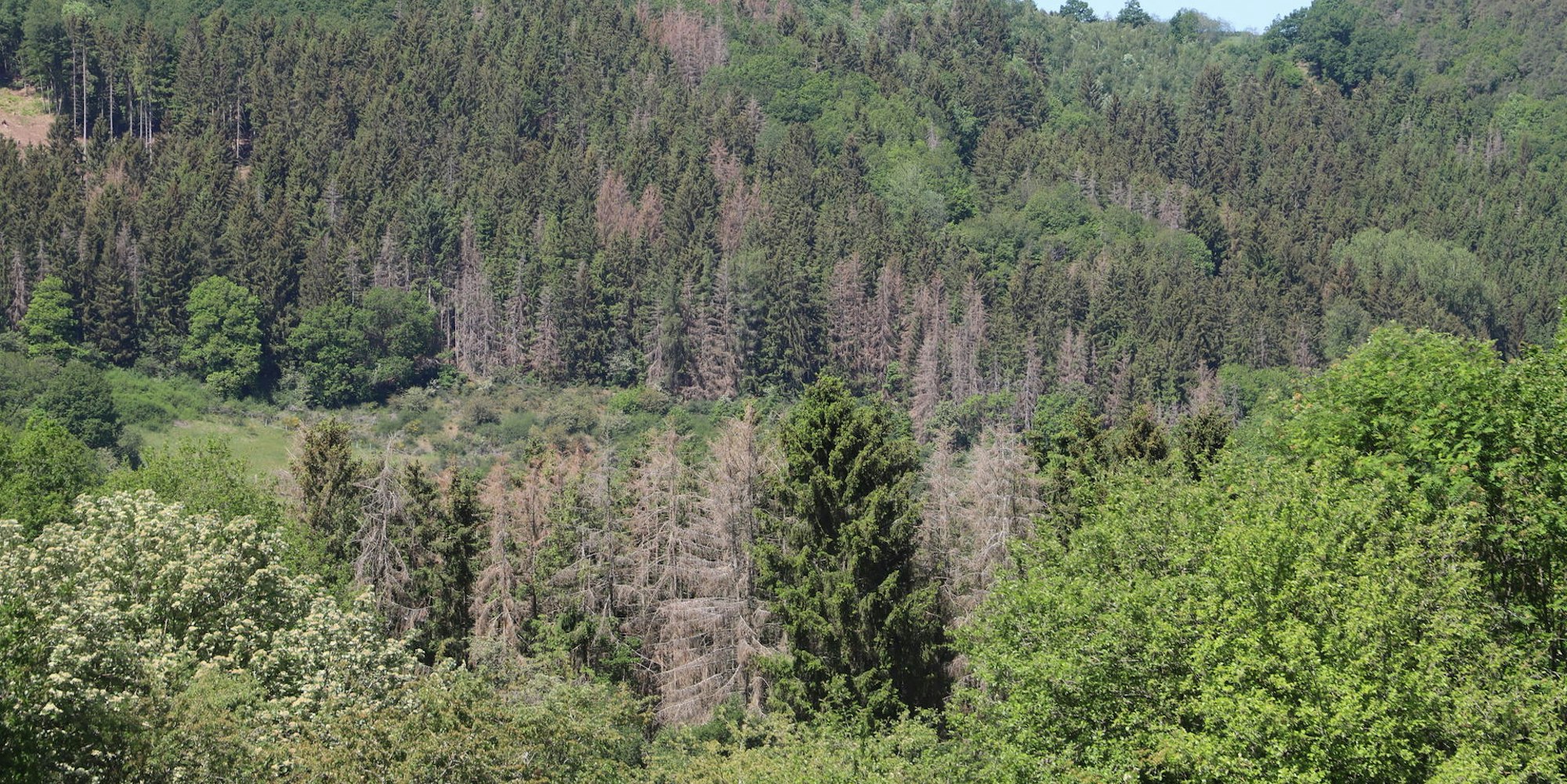 Die braunen, abgestorbenen Bäume sind in manchen Waldgebieten – wie hier bei Olef – nicht mehr zu übersehen.