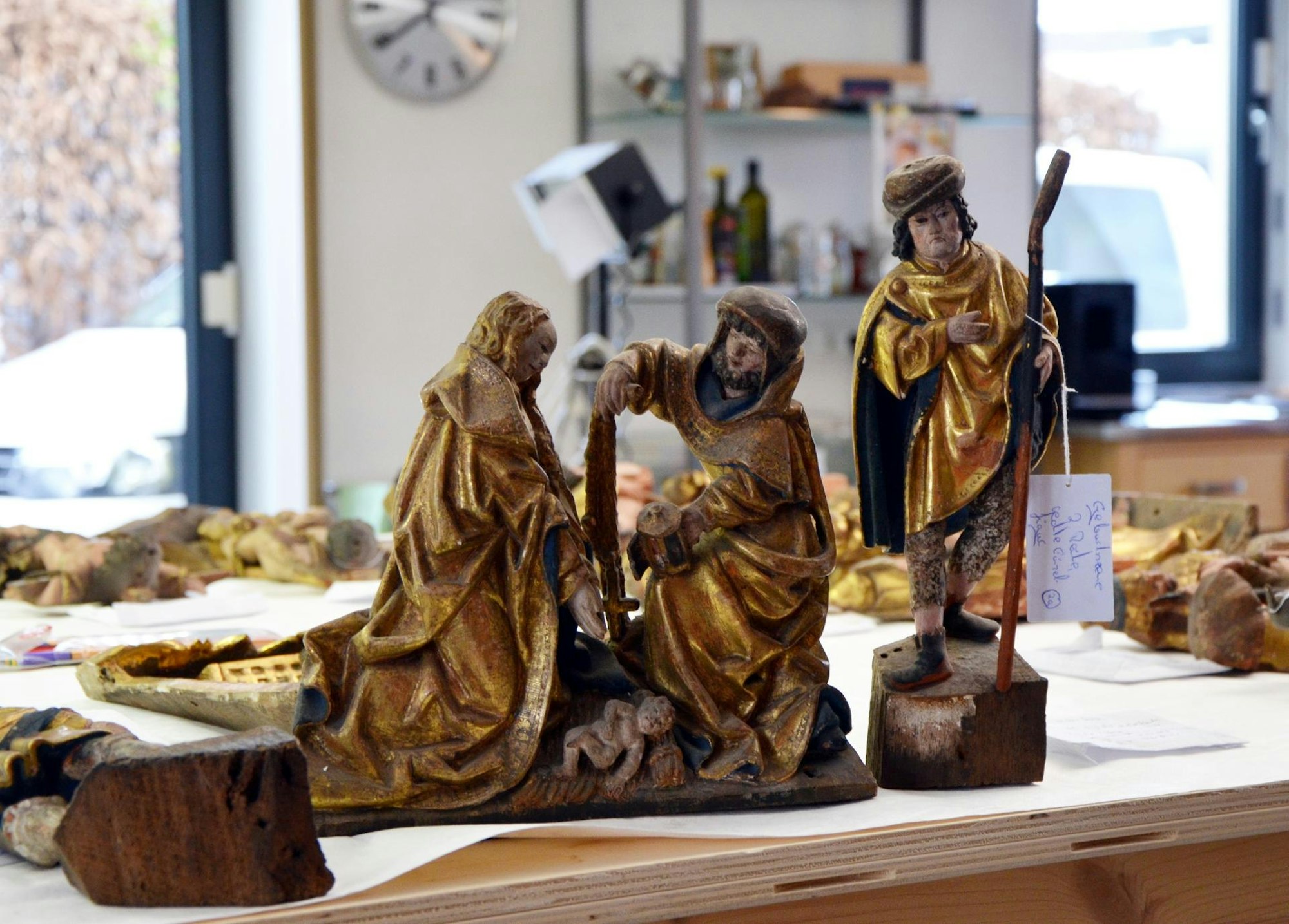 Das Gros ist – nach dem vorübergehenden Aufenthalt in Euenheim – wieder an Ort und Stelle in Xanten. Momentan liegen die noch unbehandelten Figuren aus der unteren Reihe des Altaraufsatzes auf einem großen Tisch im Erdgeschoss der Werkstatt. „Die haben wir vor drei Wochen ausgebaut“, erklärt der Restaurator. Jedes einzelne Teil ist beschriftet. „Wir haben sogar festgehalten, welche Schraube wo sitzt. Sonst wäre das im Detail nicht zu rekonstruieren.“