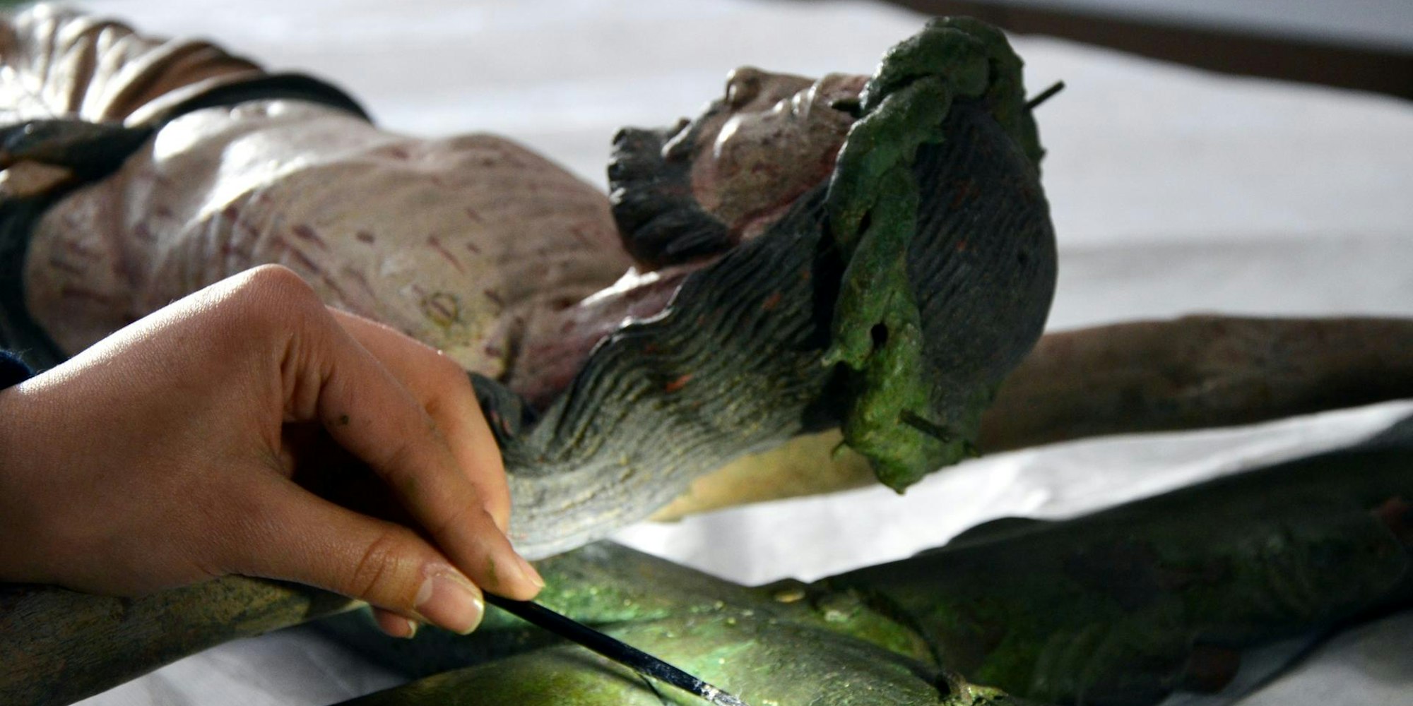 Dass am Kruzifix aus St. Martin Blätterungen der dunkelgrünen Farbe am Stamm ein Eingreifen erforderlich machen, „ist nichts Ungewöhnliches bei einem Kreuz, das an einer Außenwand hängt“, erklärt Sarah Renn. „Das Holz reagiert auf Temperatur- und Luftfeuchtigkeitsschwankungen.“
