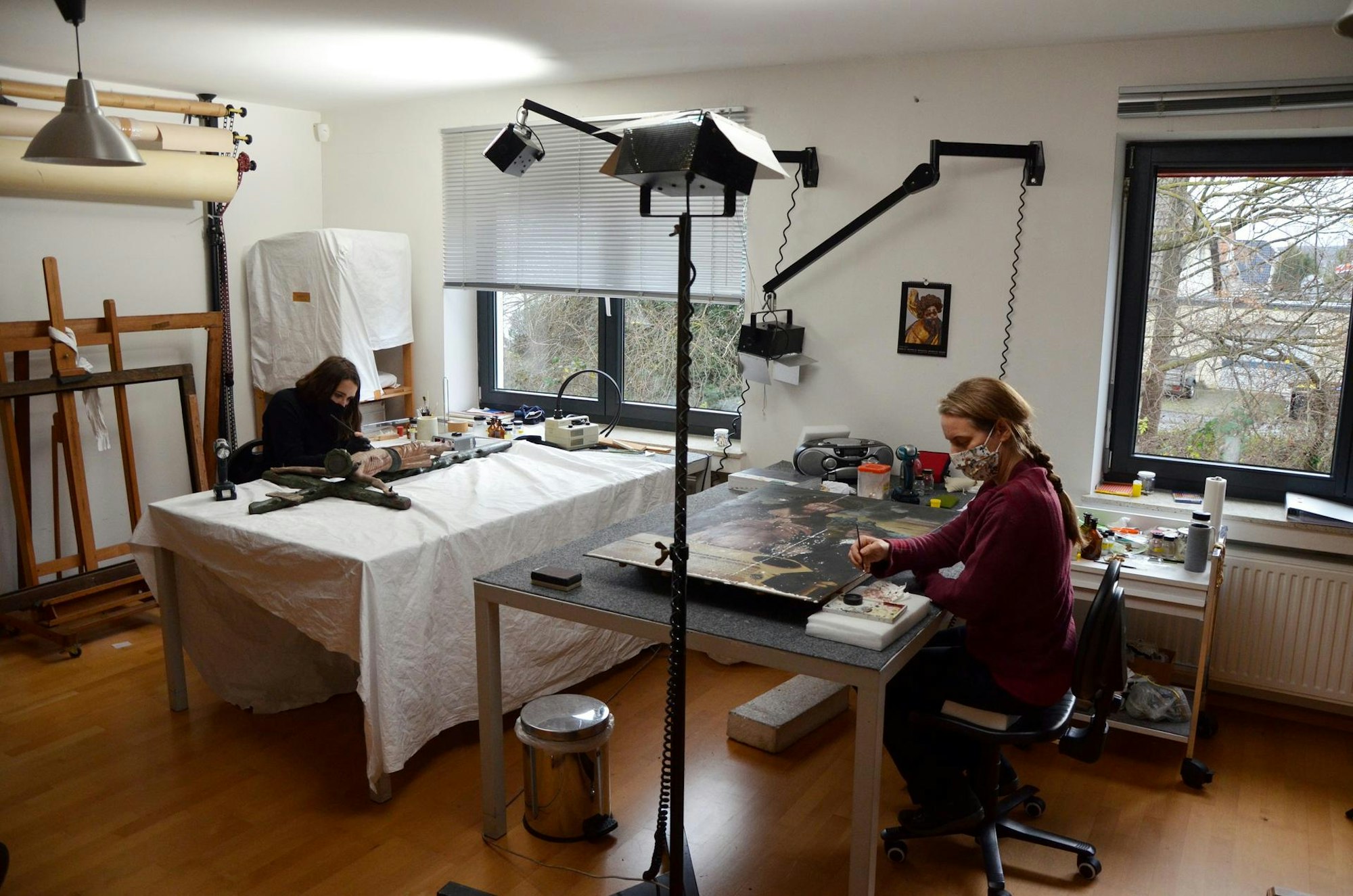 Die Werkstatt beherbergt – immer wieder aufs Neue – Kunstschätze erster Güte. Dies zeigt sich auch im Obergeschoss, wo Sarah Renn das Kruzifix aus der Euskirchener Martinskirche in Arbeit hat, während Karin Schulte ein Tafelbild aus dem St.-Annen-Museum in Lübeck restauriert. Es trägt die Inschrift „Ecce Homo“ und stammt von Hans Kemmer (um 1495 – 1561), einem Cranach-Schüler. Neben dem leidenden Christus zeigt es den Stifter des Werks, Heinrich Gerdes.