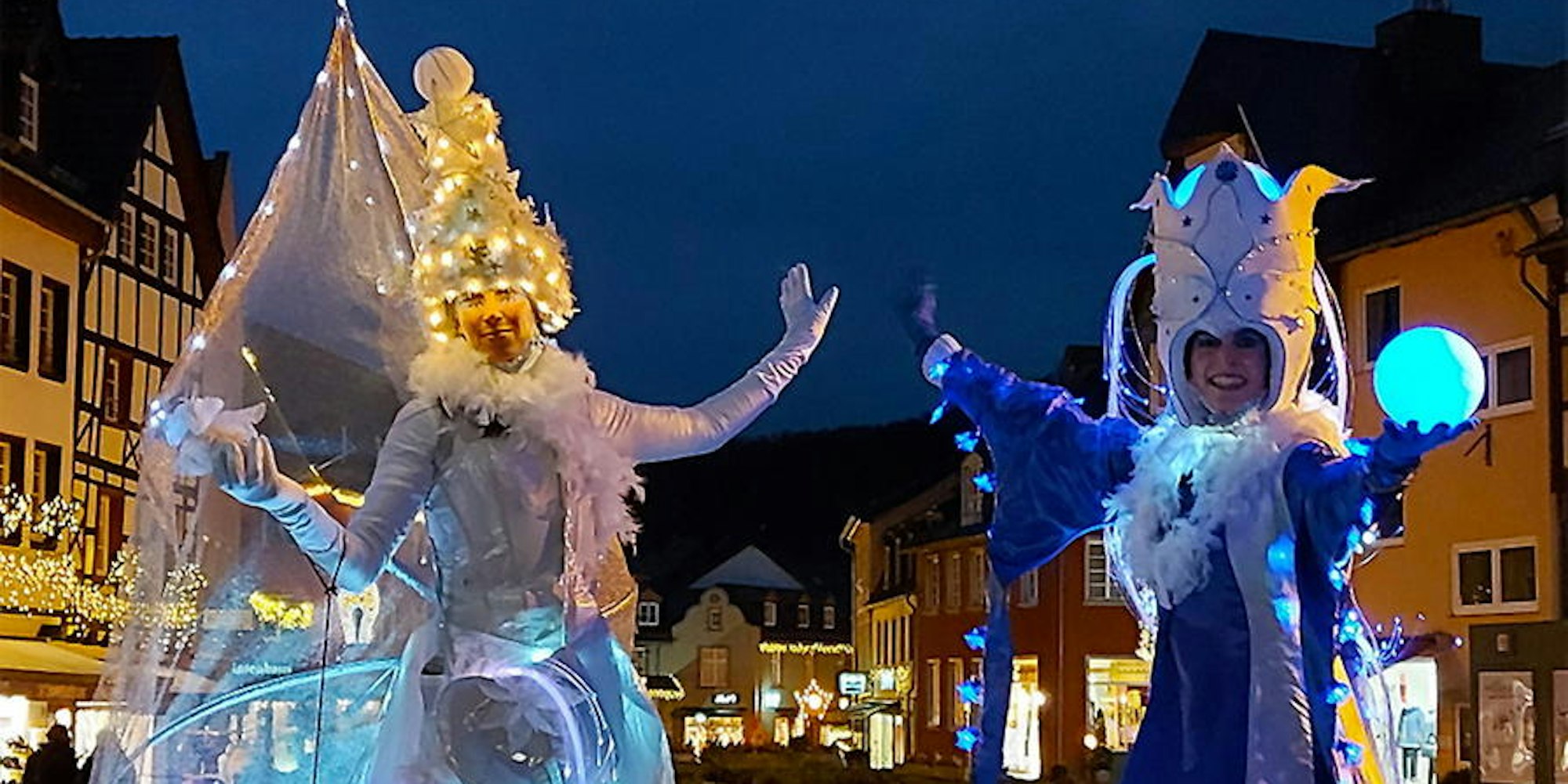 Ein Feengruß auf Stelzen: Eisprinzessin (l.) und Auraya überraschten mit Einbruch der Dämmerung die Besucher des Outlet-Centers in der Bad Münstereifeler Altstadt.