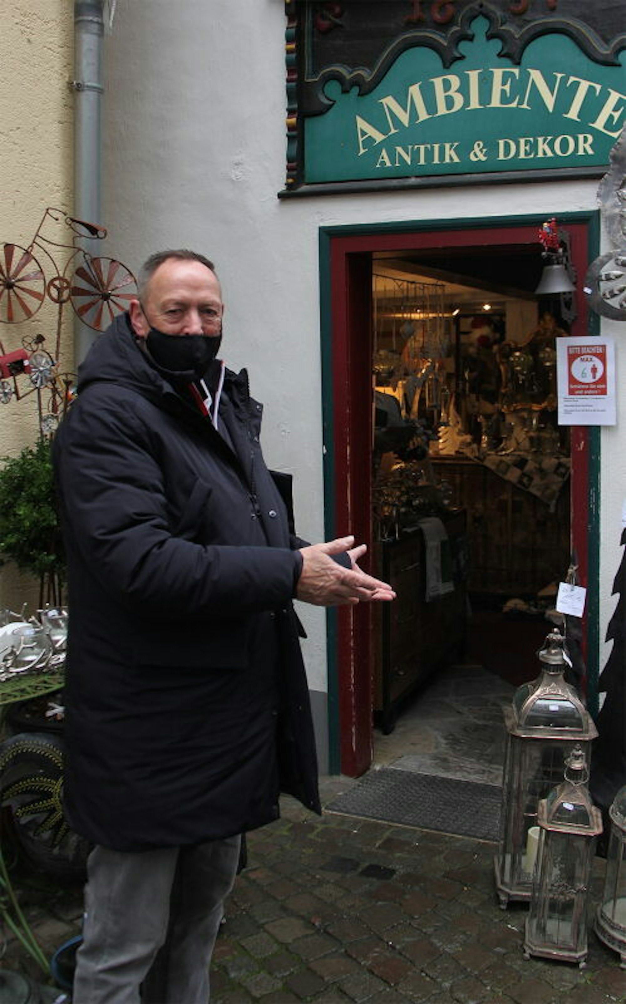 Zwischen Orchheimer und Werther Tor ist das Outlet Center in Bad Münstereifels Altstadt mit an die 50 Fachgeschäften. Dazwischen gibt es eine gute Handvoll alteingesessener, inhabergeführter Läden. Zum Beispiel das Ambiente von Fred Hannes, nach eigenen Angaben seit 35 Jahren am Platze an der Orchheimer Straße. „Ich kann Ihnen sagen, warum es heute ruhiger ist als sogar am vergangenen Samstag“, sagt Hannes und bestätigt den Eindruck aus Euskirchen: „Die Kunden haben sich seit dem Frühjahr an den Lockdown gewöhnt. Sie kaufen Online.“ Tatsächlich sind die Gassen am Nachmittag nicht überlaufen. „Das fing am Vormittag sehr ruhig an, dann wurde es kurz voller. Vor einer Woche waren es jedenfalls mehr Leute“, sagt auch Angela Müller. Sie steht am Wurstgrill des Imbissstands von Josef Müller direkt an der Ecke Markt-/Werther Straße mitten im Geschehen.