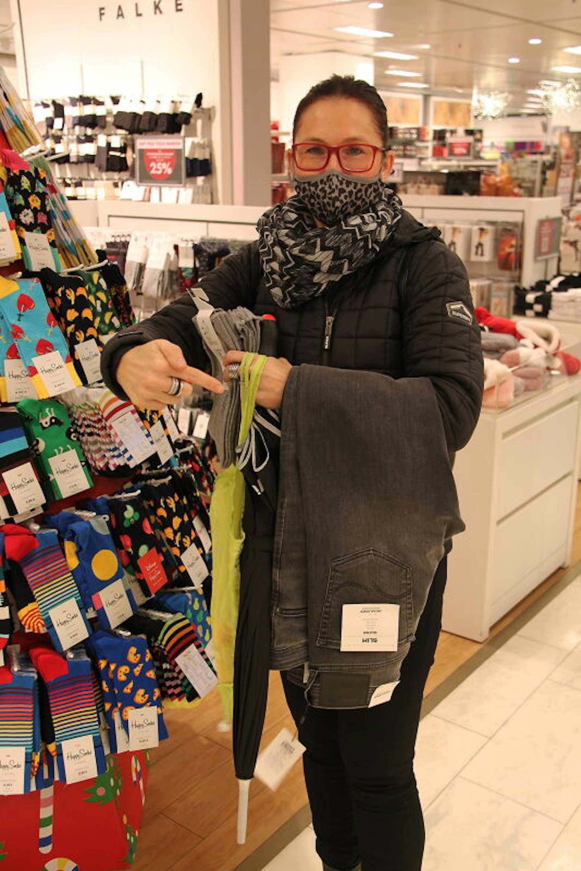 „Ich bin nicht wegen der Weihnachtsgeschenke hier. Mir fehlte noch das hier“, sagt Petra Kowalke aus Swisttal und deutet auf eine Herrenhose, die sie über dem Arm trägt: „Die Socken kamen noch wegen 25 Prozent Rabatt dazu.“ Die Hose habe sie bewusst nicht im Internet bestellt – wegen eines Umtauschs, falls sie nicht passt.