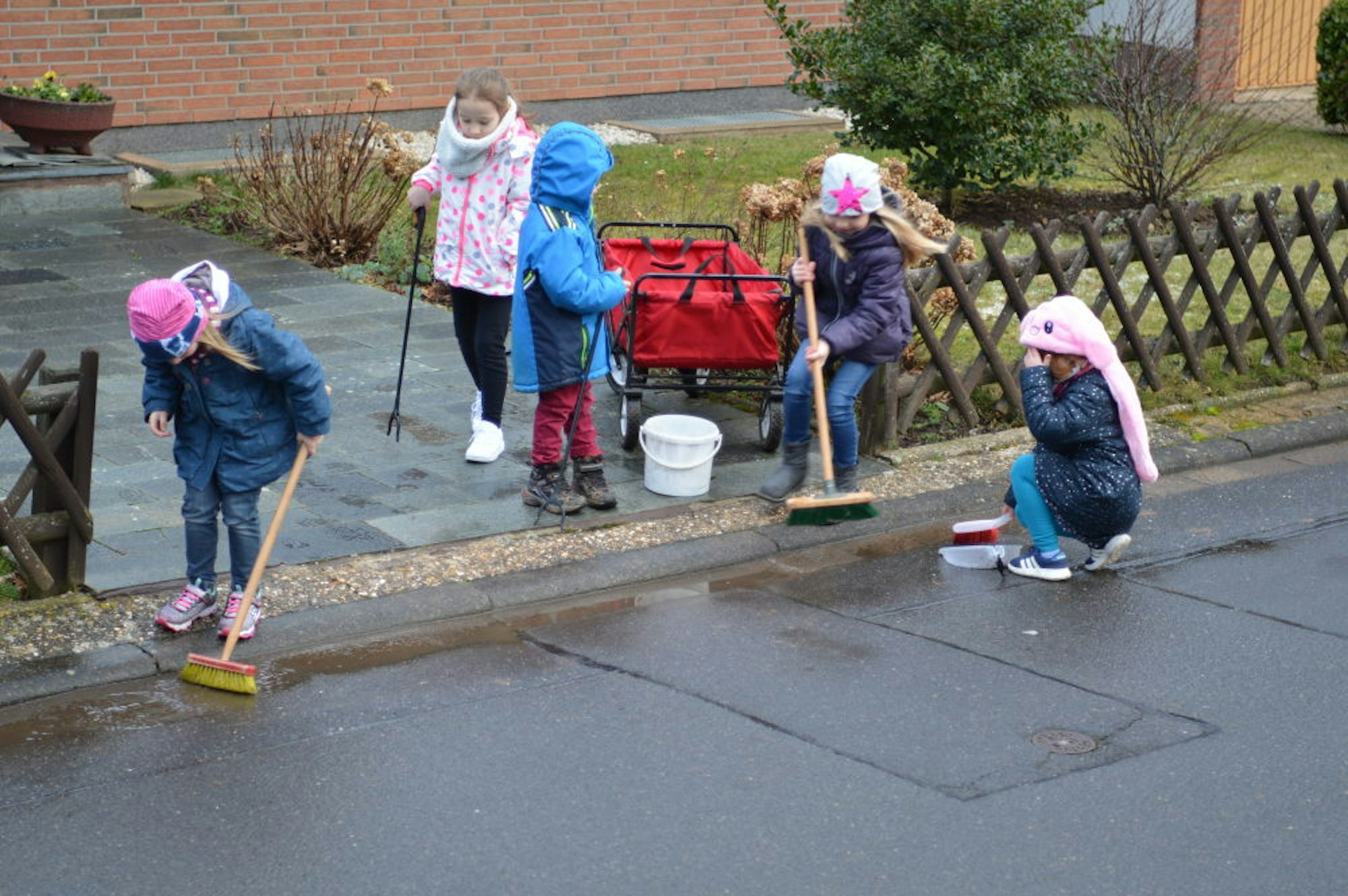 Mit Feuereifer schrubben und putzen die sechs Kinder die Einfahrt und den Rinnstein am Haus von Anneliese Metzmacher.