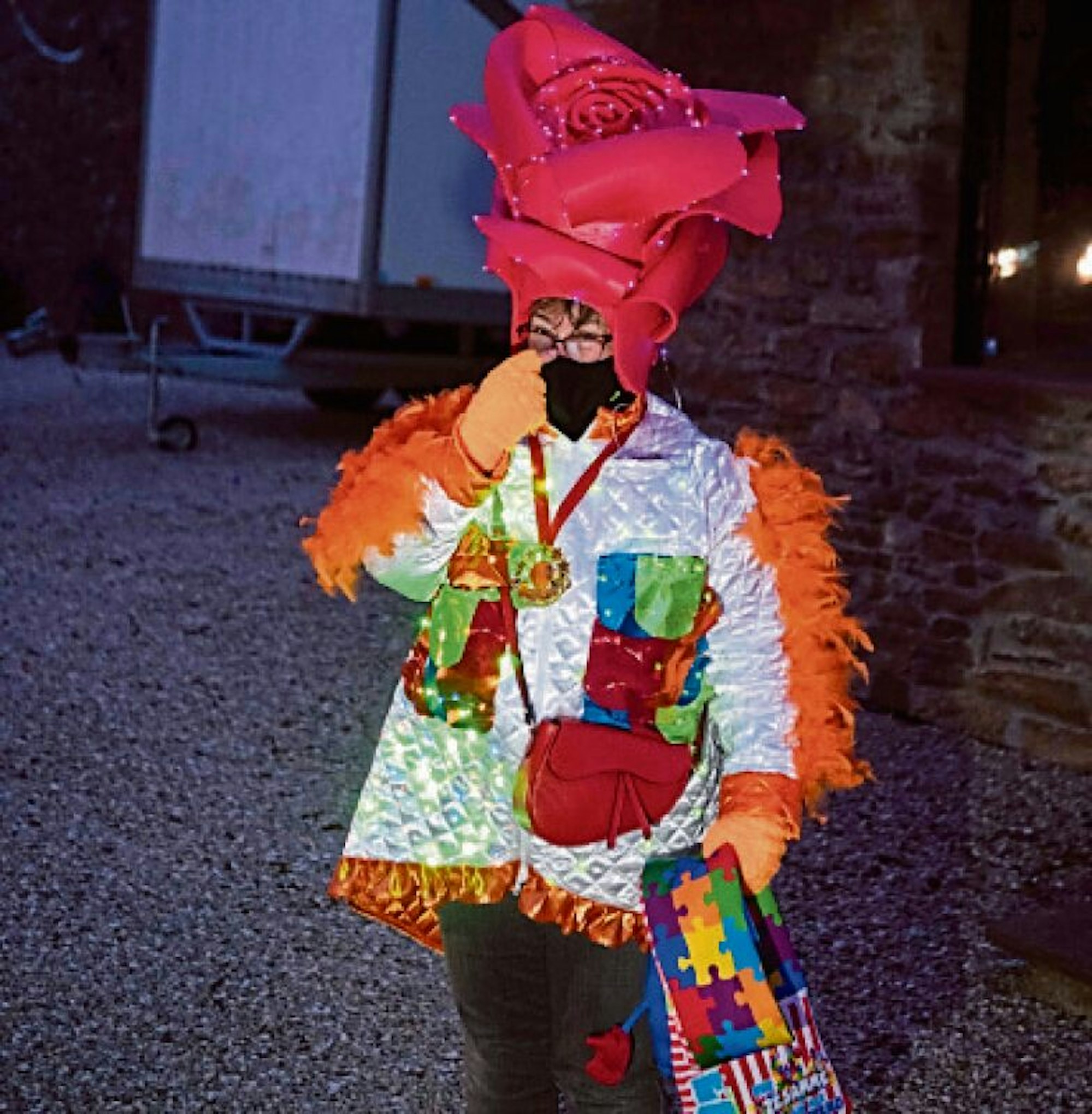 Freude und Wehmut, die gehen an diesem Abend ohnehin Hand in Hand den Alten Weg hoch. Der bildet – normalerweise – die erste Hälfte des Zugwegs. Kurz vor der Kirchenkurve bildet sich – normalerweise – ein Stau, da alle die schönste Lichterzug-Passage in vollen Zügen genießen wollen. „Hier nehmen wir sonst richtig Schwung“, stellen Heike Wahlen und Anneliese Urfell fest. Letztere hat für den Spaziergang einen Kostümmix gewählt. Die Eulen-Jacke vom vergangenen Jahr, der Rosen-Hut vom Jahr davor. Da sie mit Kostümen ihren Wintergarten dekoriert, sind die auch schnell parat für ein bisschen Fastelovends-Jeföhl.