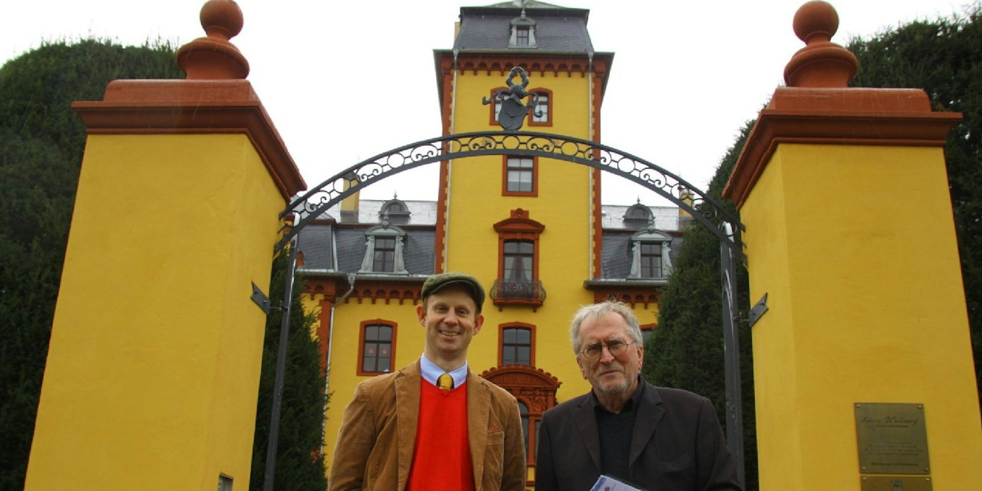 Wolf Werth (r.) von der Deutschen Stiftung Denkmalschutz und Dr. Ulrich Müller von Blumencron montierten die Tafel, die auf die Förderung durch der Stiftung hinweist.