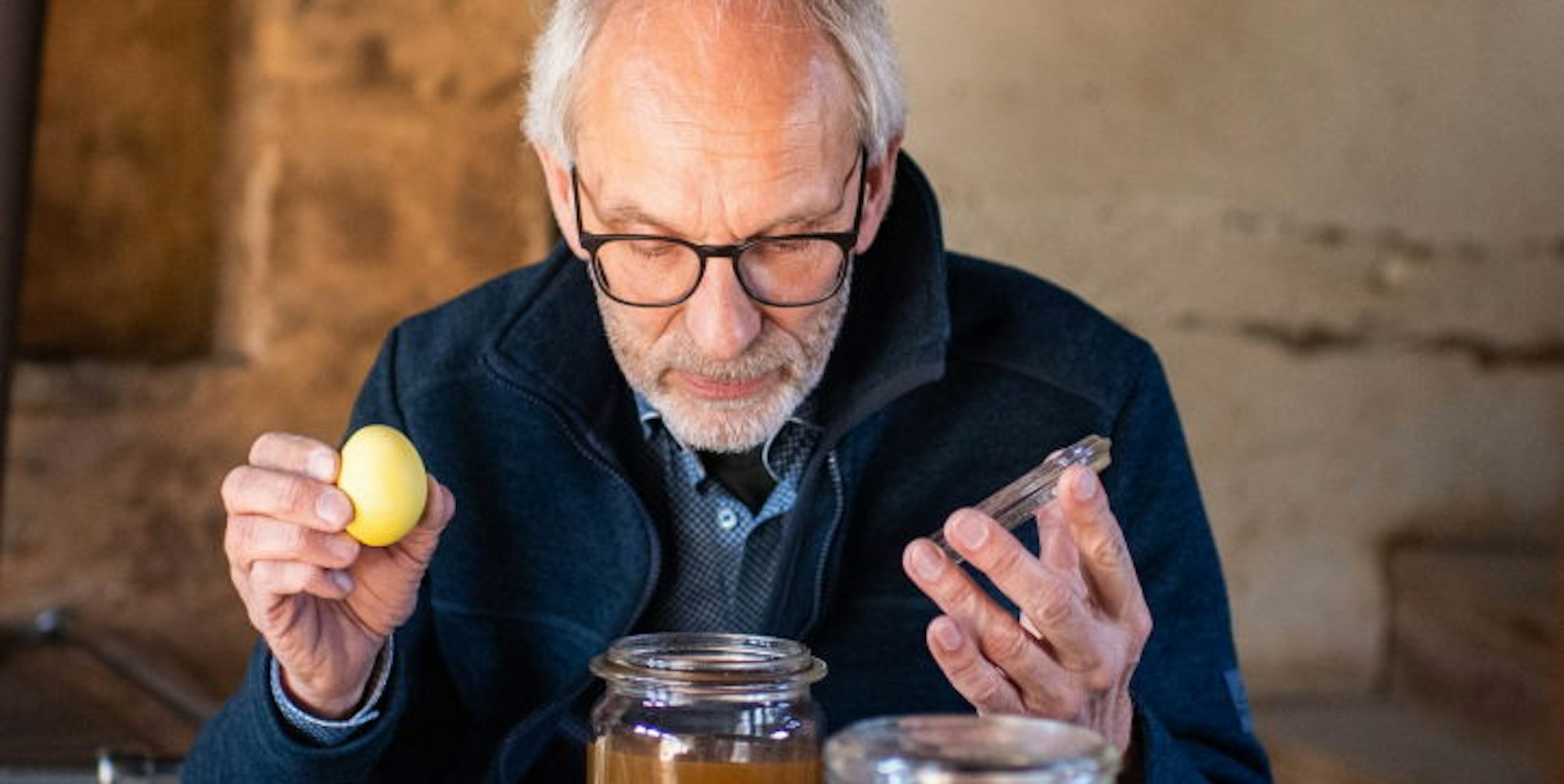 Natürlich gefärbte Eier: Museumsleiter Dr. Josef Mangold riecht am Färbemittel.