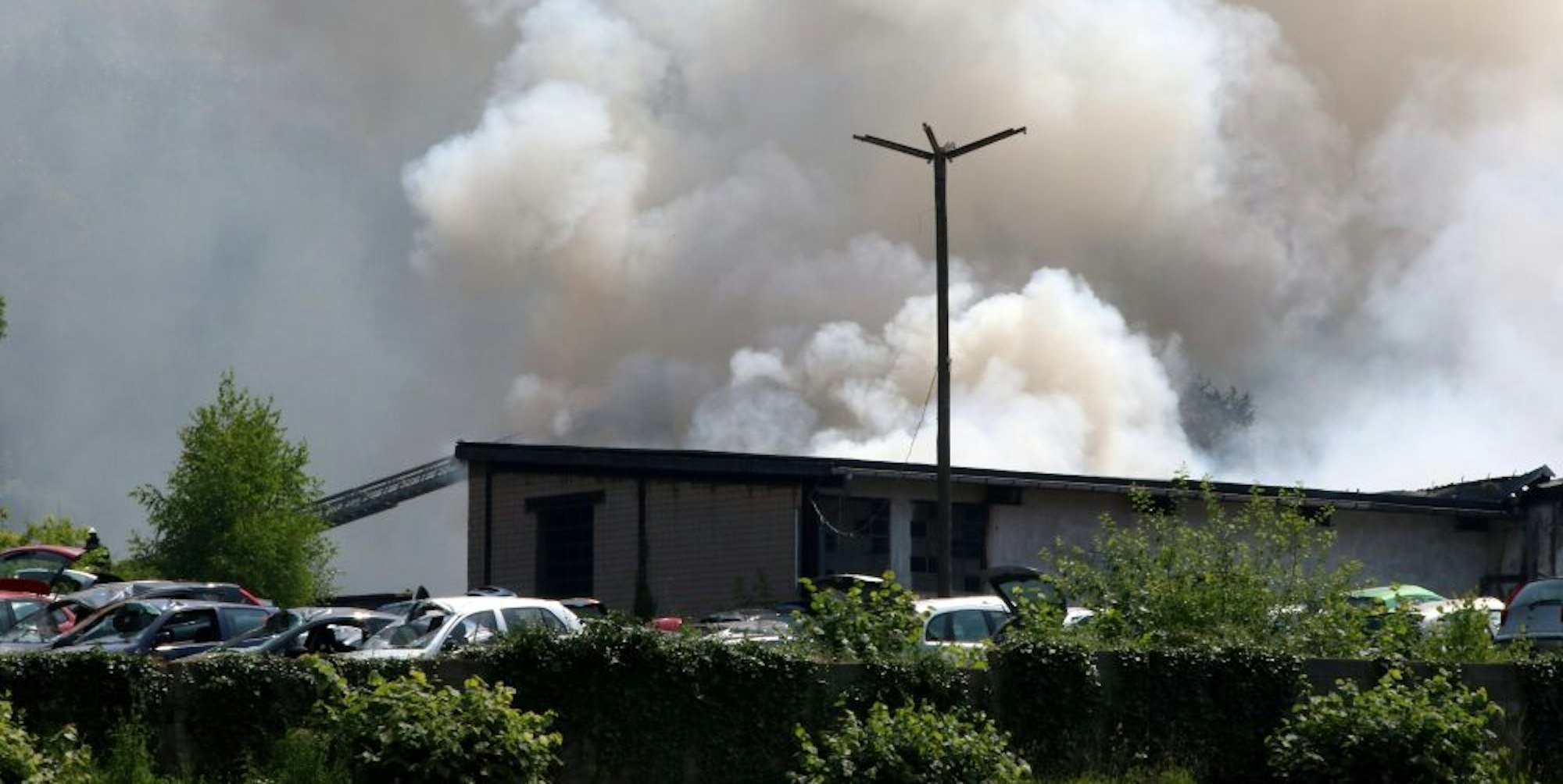 Mechernich-Kalenberg – Zu einem Großeinsatz der Feuerwehren kam es am Freitag kurz vor 14 Uhr in Kalenberg. Bei einer Autoverwertung brannte die Werkstatthalle in voller Ausdehnung. Eine riesige Rauchwolke wies den anrückenden Einsatzkräften den Weg. Auf dem Gelände, wo mehrere Hundert ausgemusterte Fahrzeuge verwertet werden, hielten sich zum Zeitpunkt des Feuers neun Menschen auf, die aber alle unverletzt blieben.