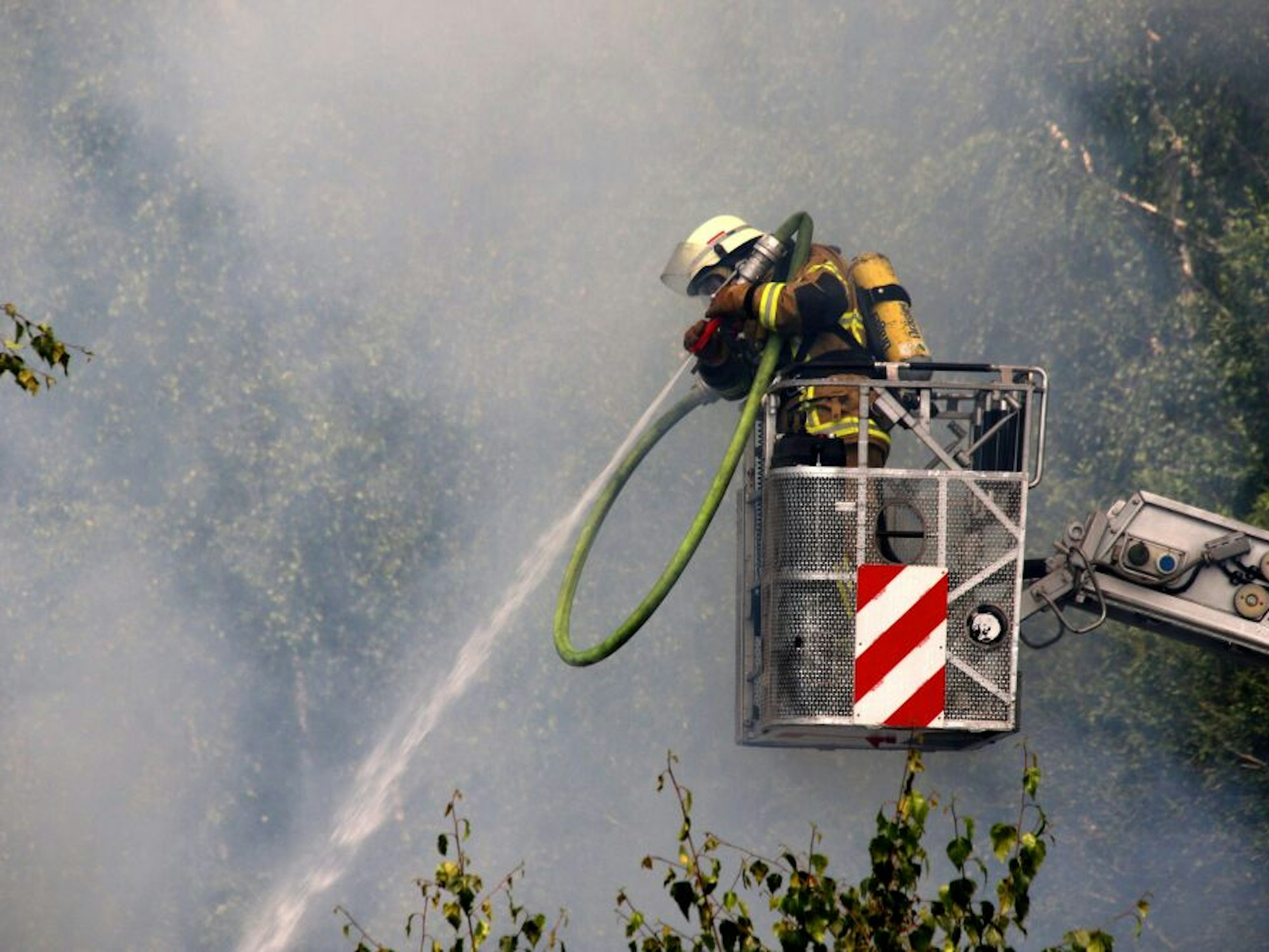 Unter schwerem Atemschutz konnten die Feuerwehrleute den Brand sehr effektiv von der Drehleiter aus bekämpfen.